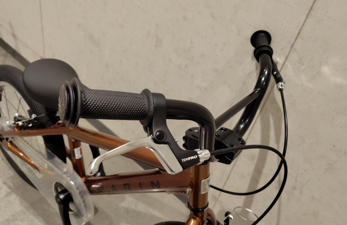 ハンドルはアップライズしたBMXタイプです。ハンドル幅は48cmほどで小さいお子様には広めでゆったりとした操舵感になっております。グリップはキッズバイク用のショートグリップ、ブレーキレバーはテクトロのショートリーチタイプが採用されているので、レバーに指が掛かりやすくなっています。