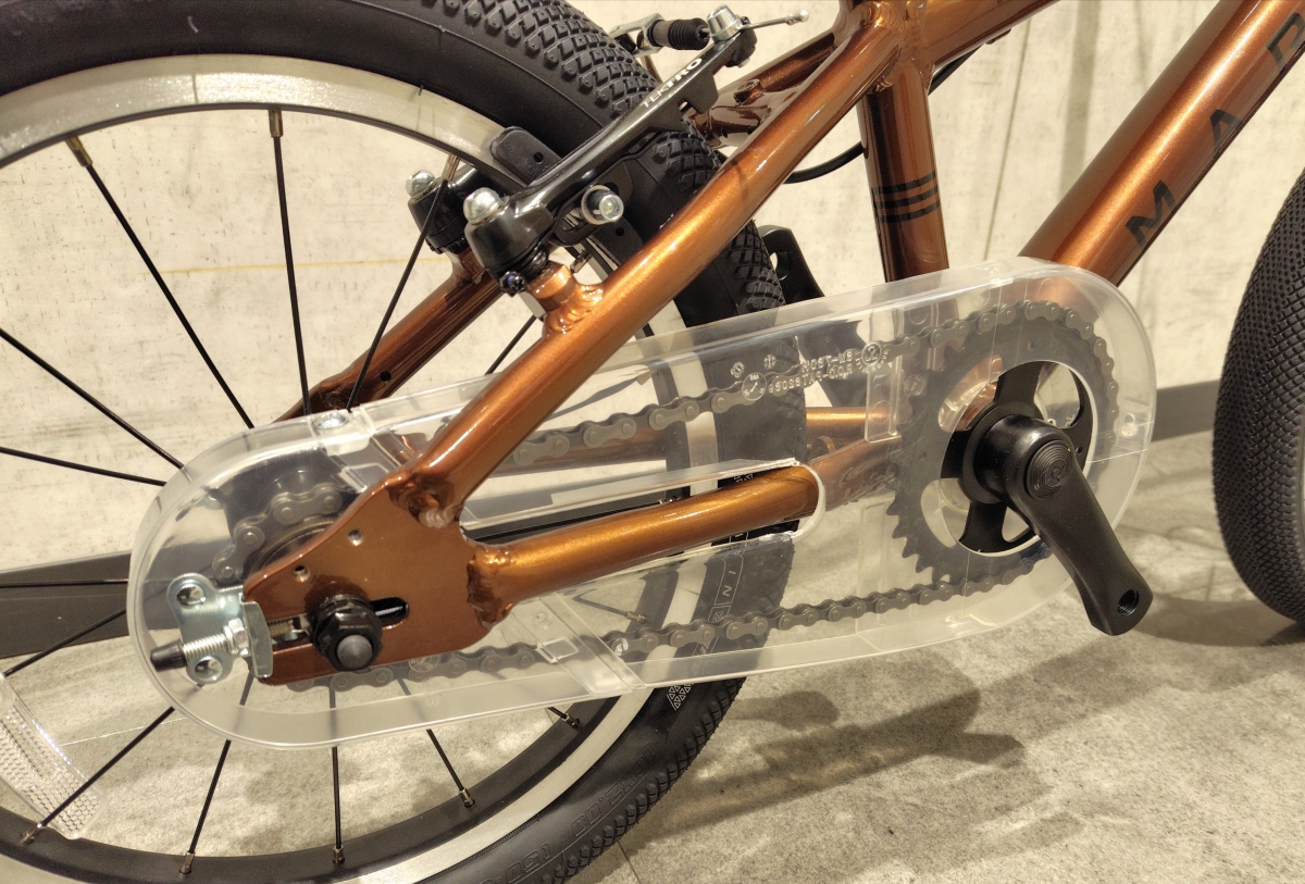 ギヤは32x18Tのシングルスピードです。クランク長は乗車身長に合わせて短いタイプが採用されています。チェーンケースが標準装備されているので巻き込みによる汚れやケガを防止できます。ブレーキはテクトロのVブレーキ、タイヤサイズは16×2.0と太めで安定感とクッション性が高いです。