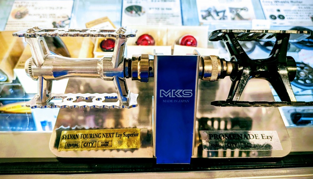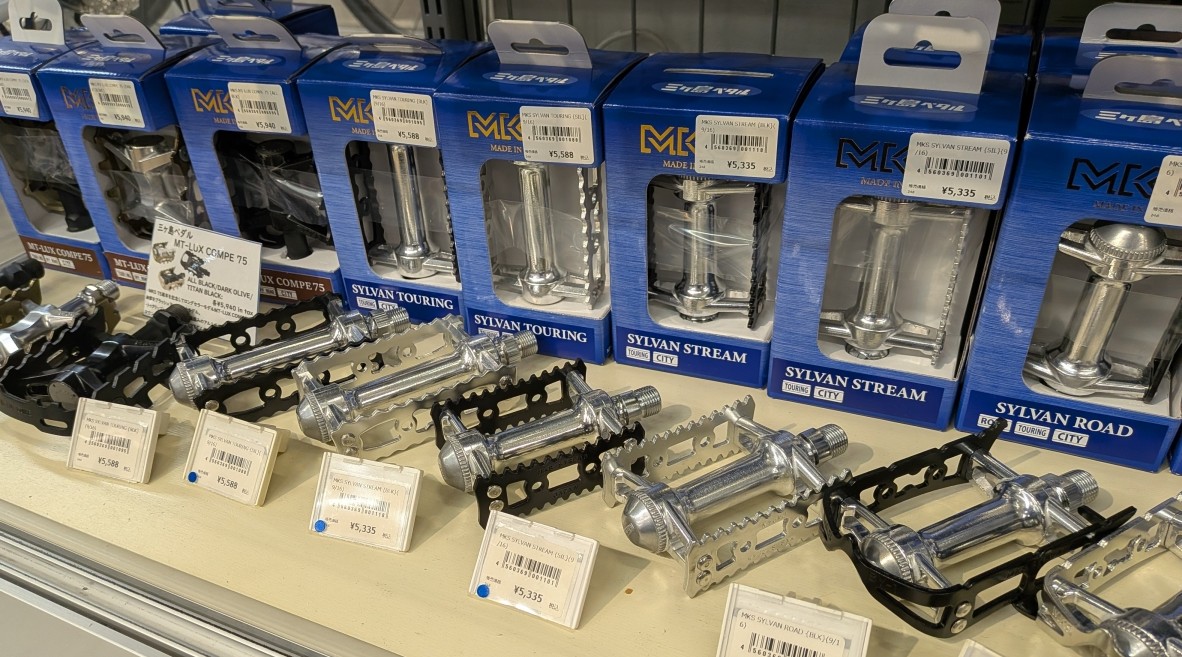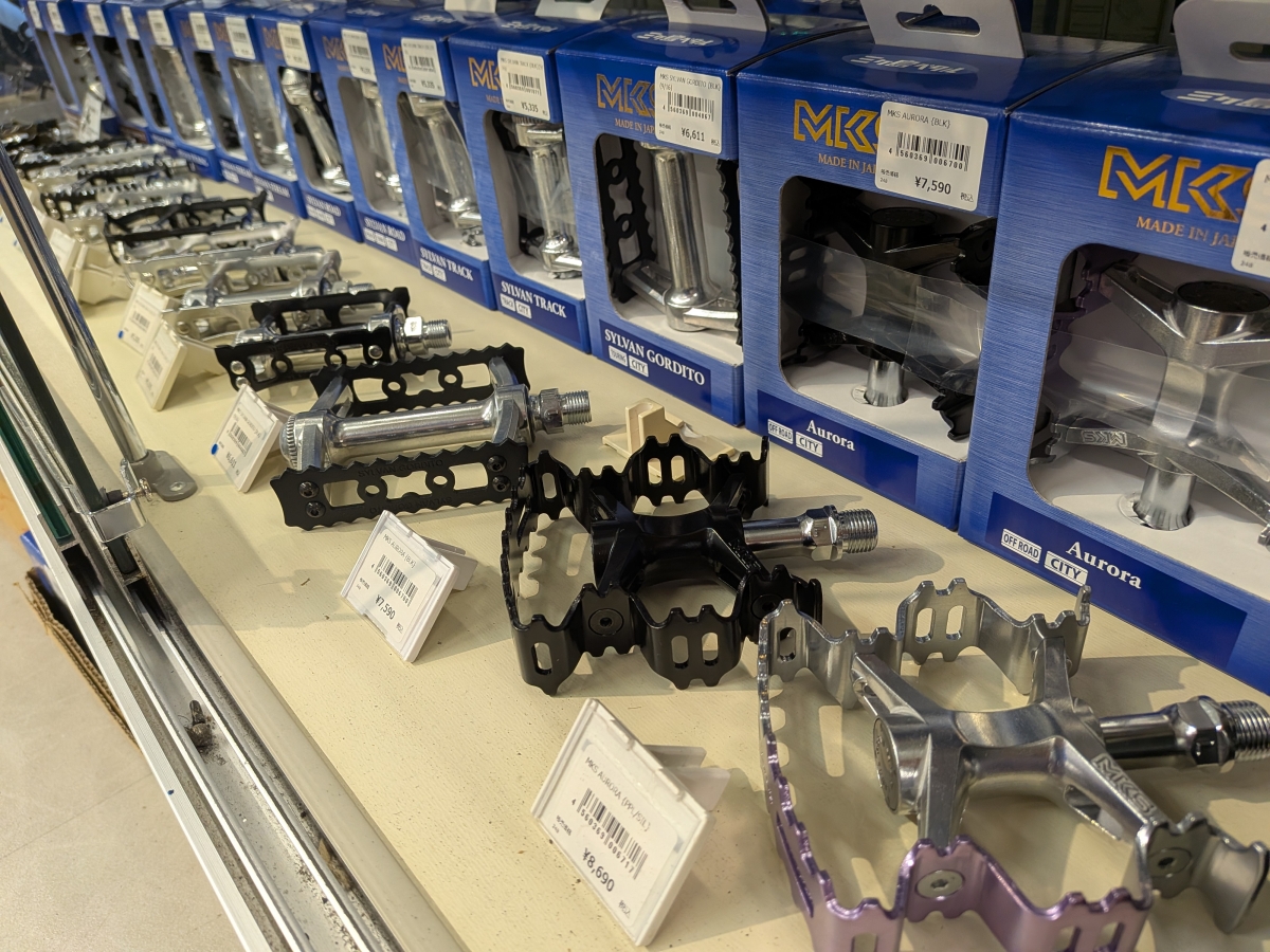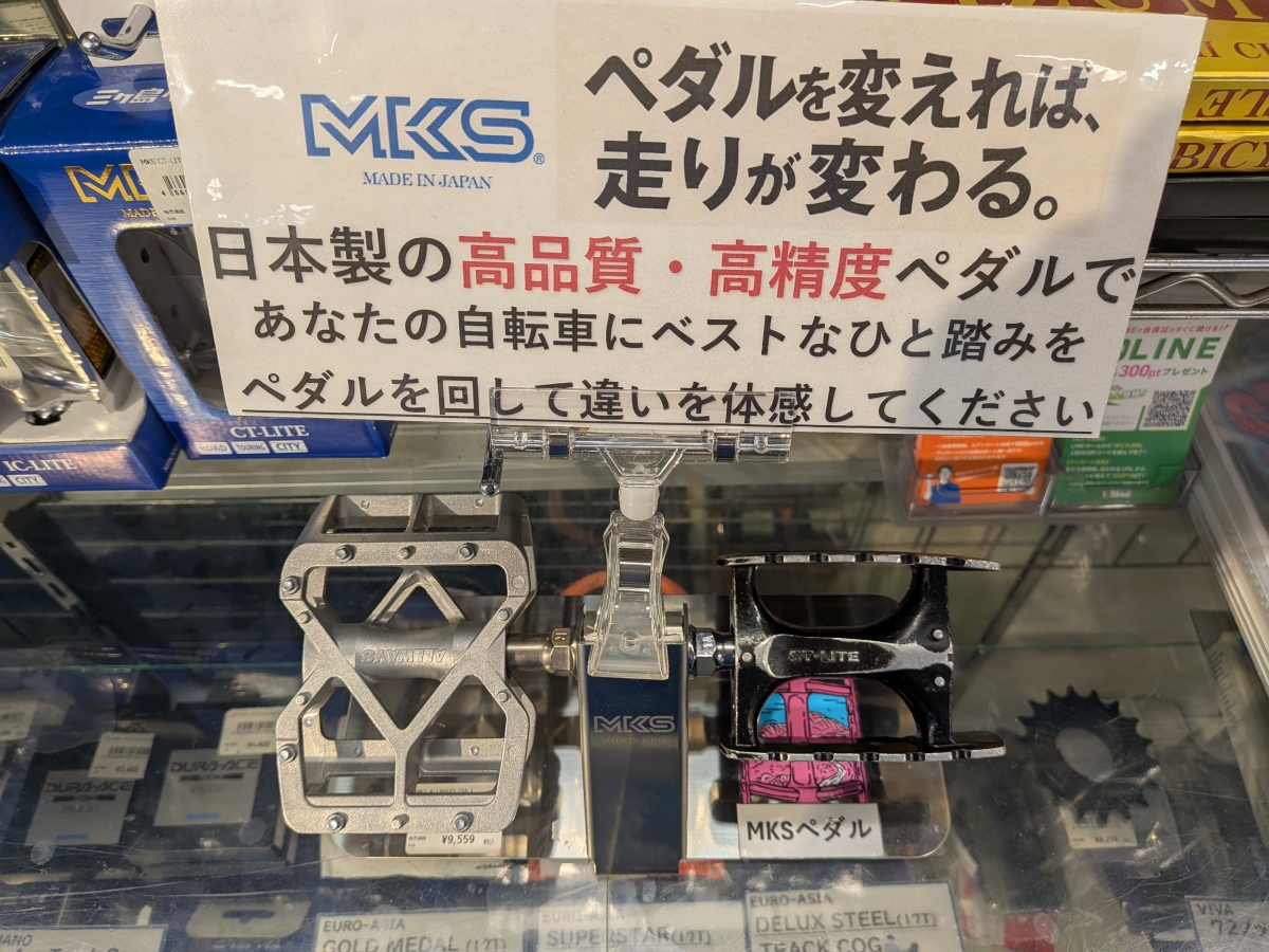 MKSペダルはそのすべてがMADE ㏌ JAPANという徹底ぶり。当店ではクロスバイクからピストバイク、フォールディングバイクにもオススメなペダルを大量に展示中です。