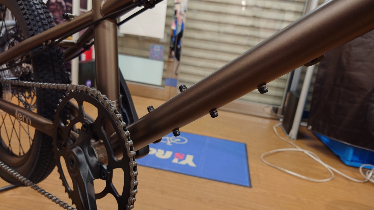 前述の通りフレームに多数のダボ穴があるので、バイクパッキングや荷台取付のカスタムにも!