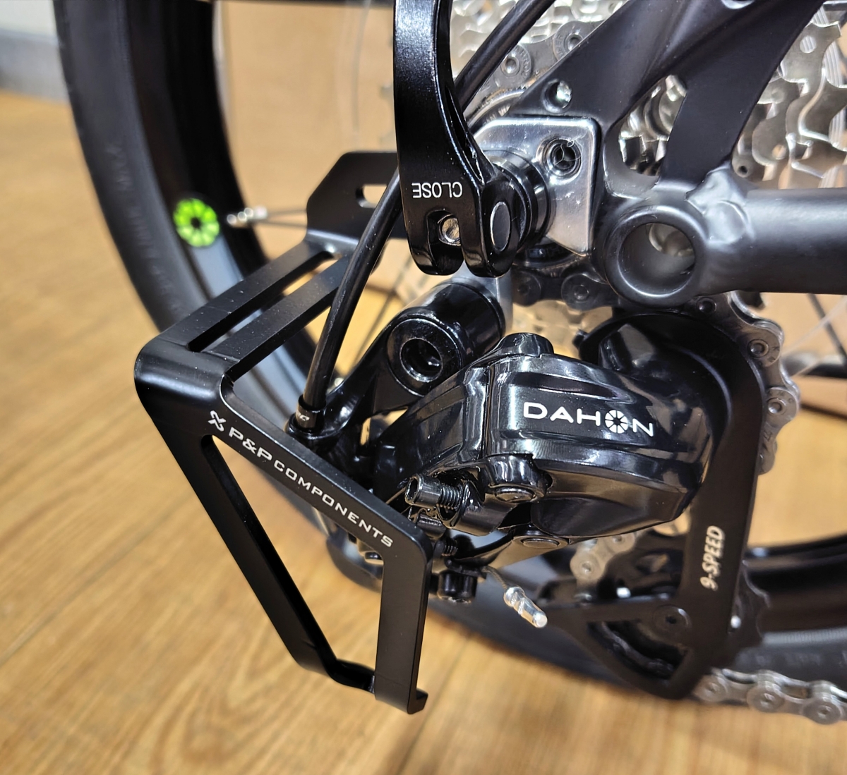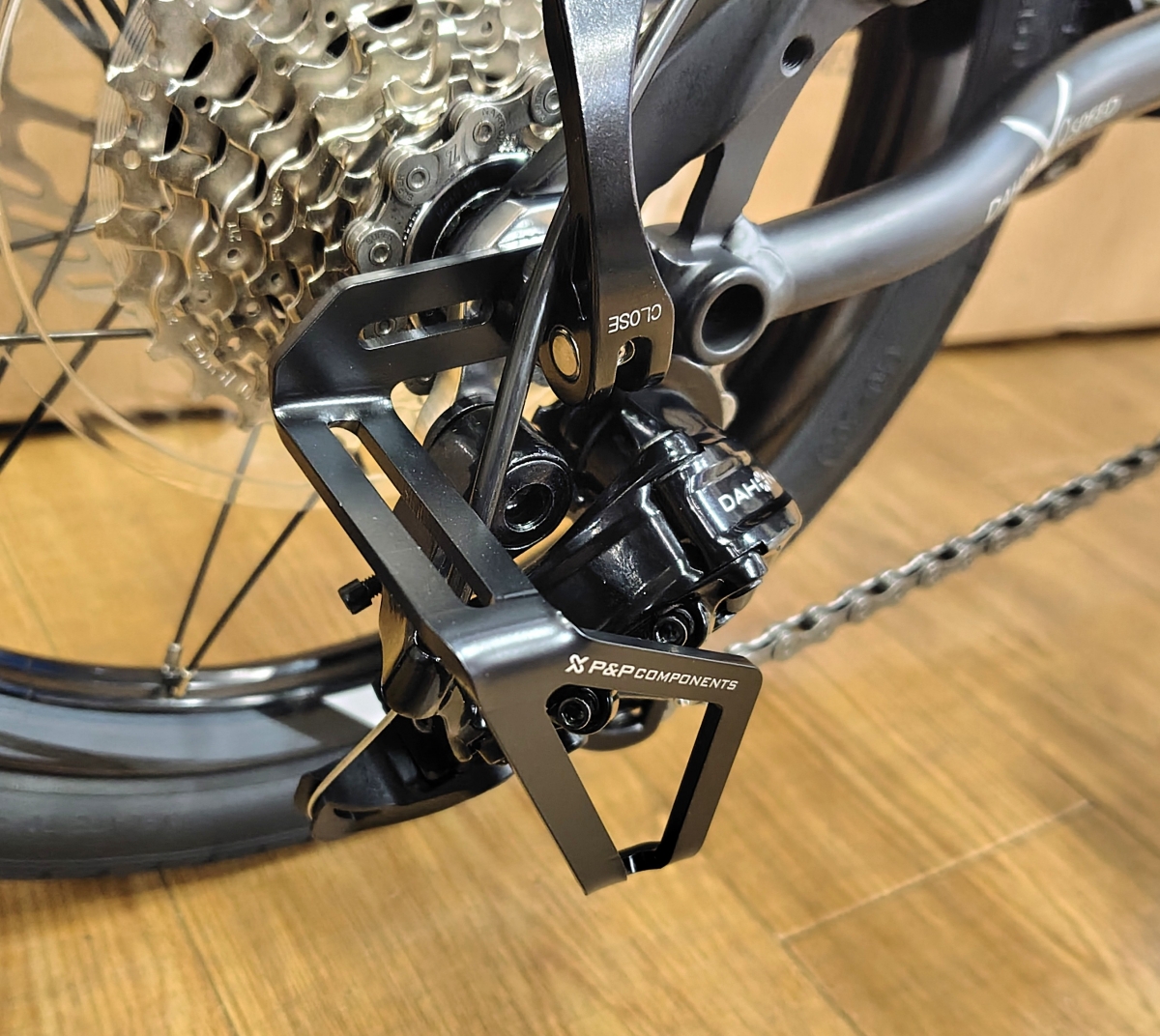 フレーム側のクイックシャフトを固定するエンド部分の溶接個所が当たらないように、取り付け部分から後方にプレートが伸びてからディレイラーをガードする形状になっています。素材はスティールで出来ているので見た目より丈夫です!