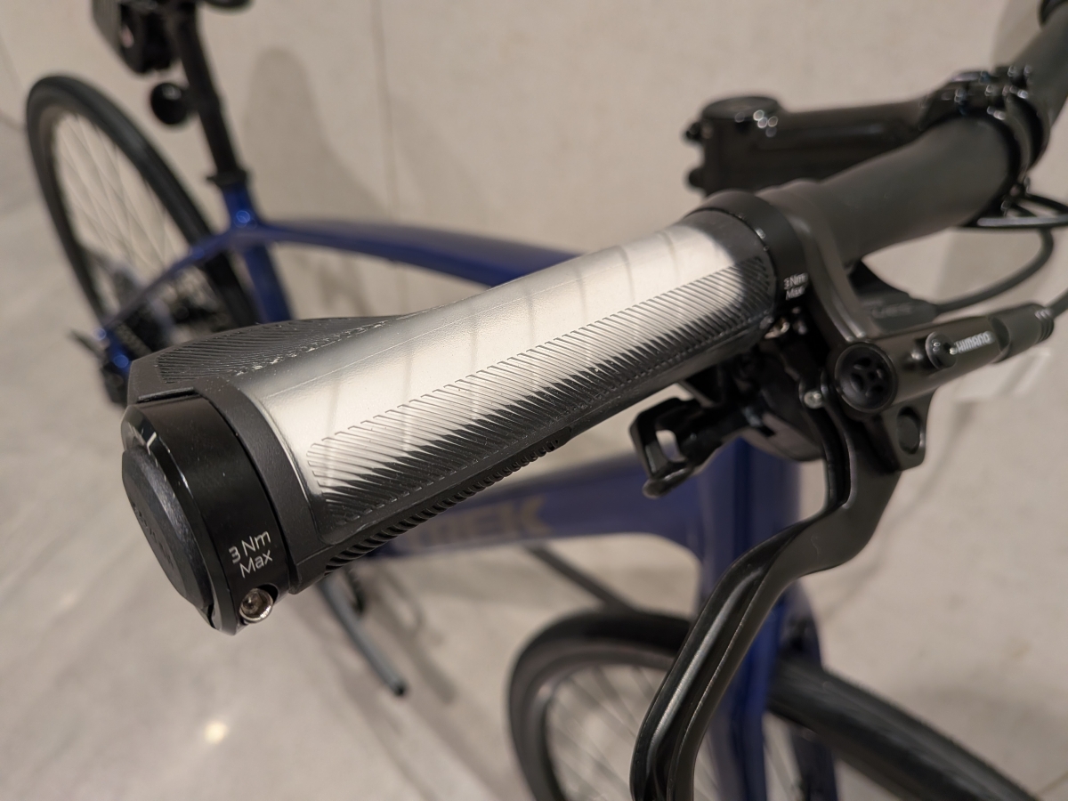 グリップにはBONTRAGERオリジナルのIsoZoneグリップを採用。今となっては入手不可となったグリップですが、ハンドルバーに内蔵されたクッションと相まって、手のしびれや疲れを感じにくくなっています。