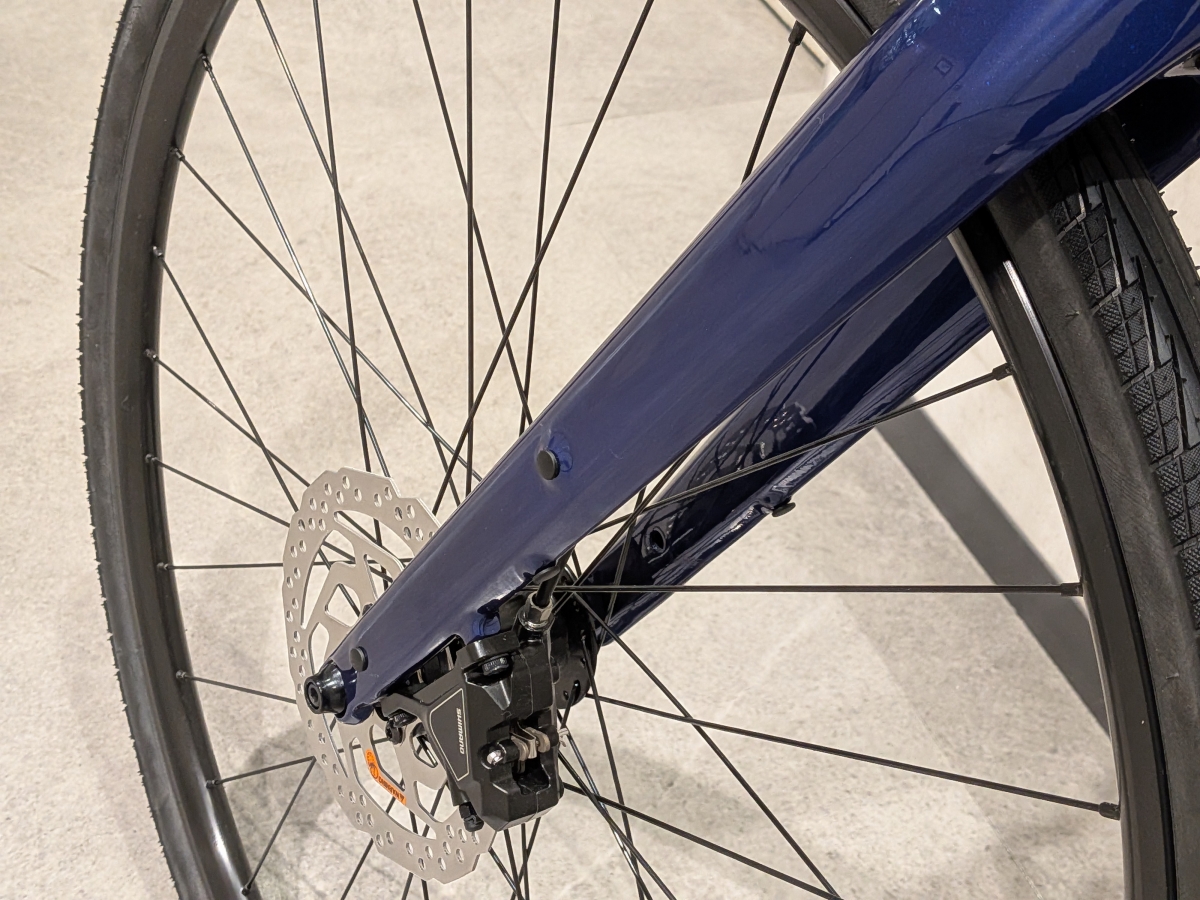振動吸収性の高いカーボン素材をフロントフォークに採用。路面の凸凹や段差の衝撃を和らげてくれます。金属フォークと違って溶接痕が無いのも高級感が合って良いですね。