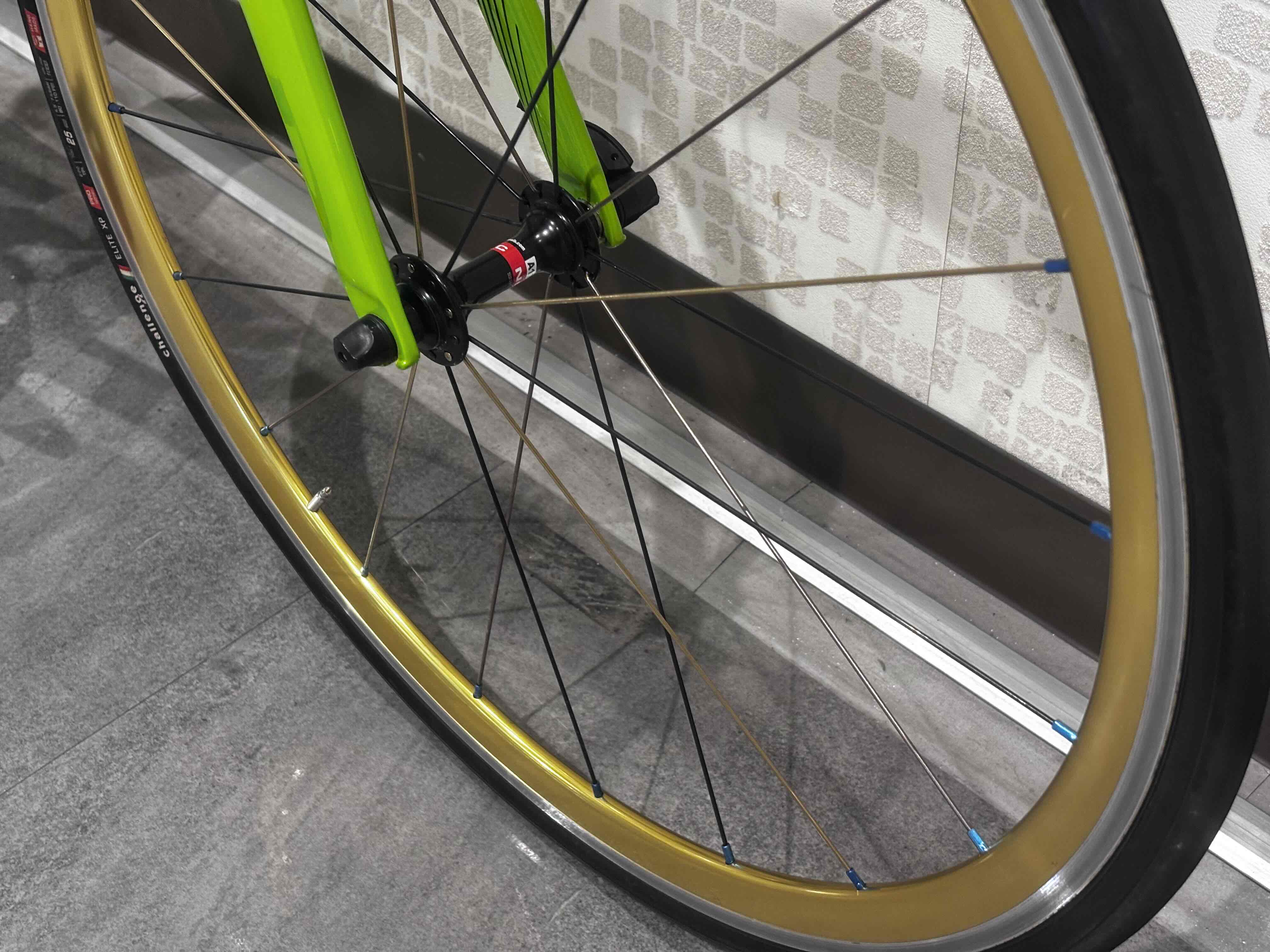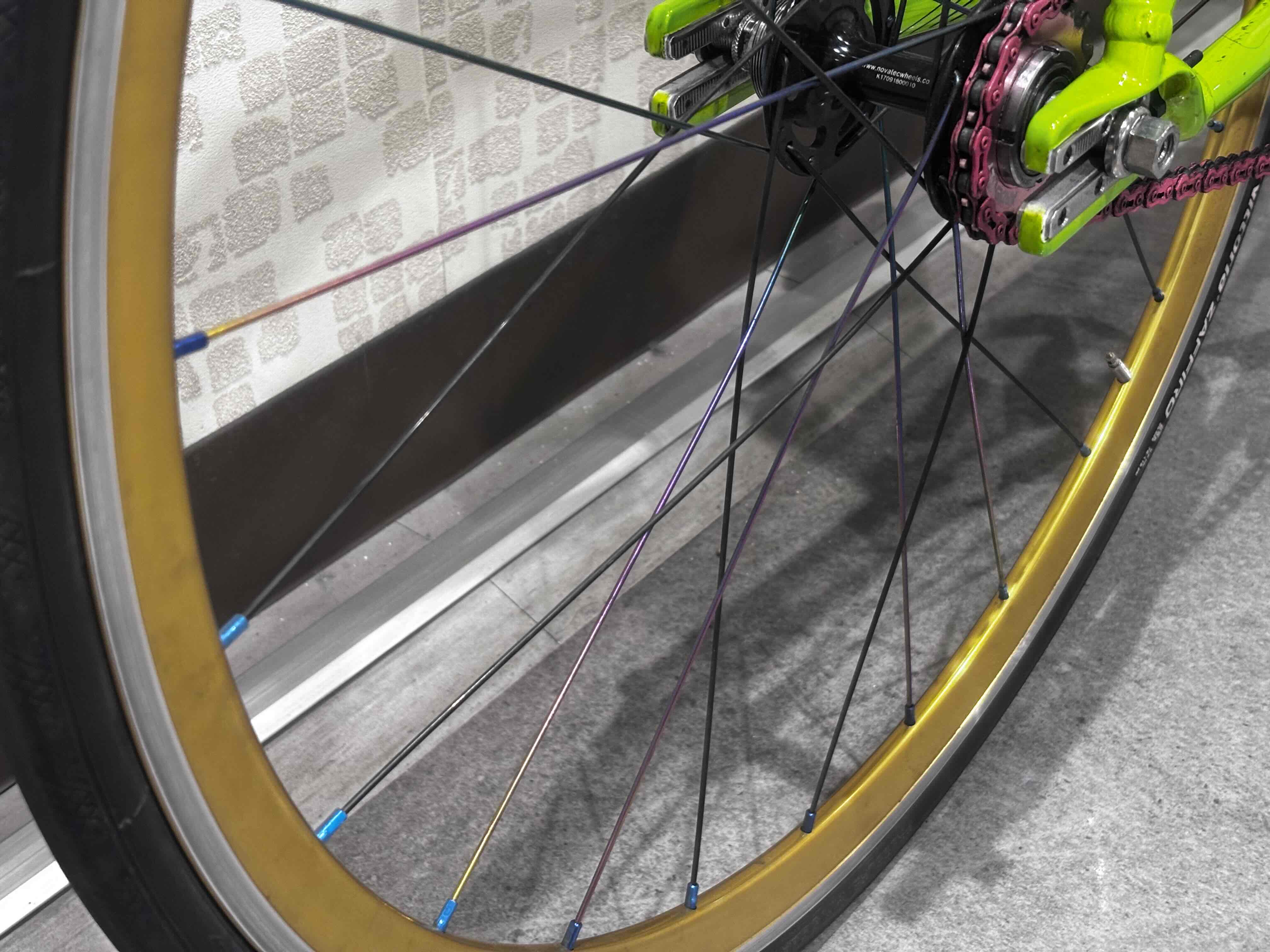 フレームの次に、パッと目に入るカラーホイールはリム+スポーク+ハブをチョイスしての手組カラーホイール。