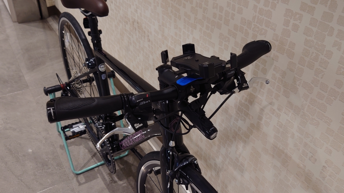 ハンドル周りはライトとスマホホルダーを共存させるために各種アダプタを使い、取付位置をセンターにする事でワイヤー類との干渉を避けました