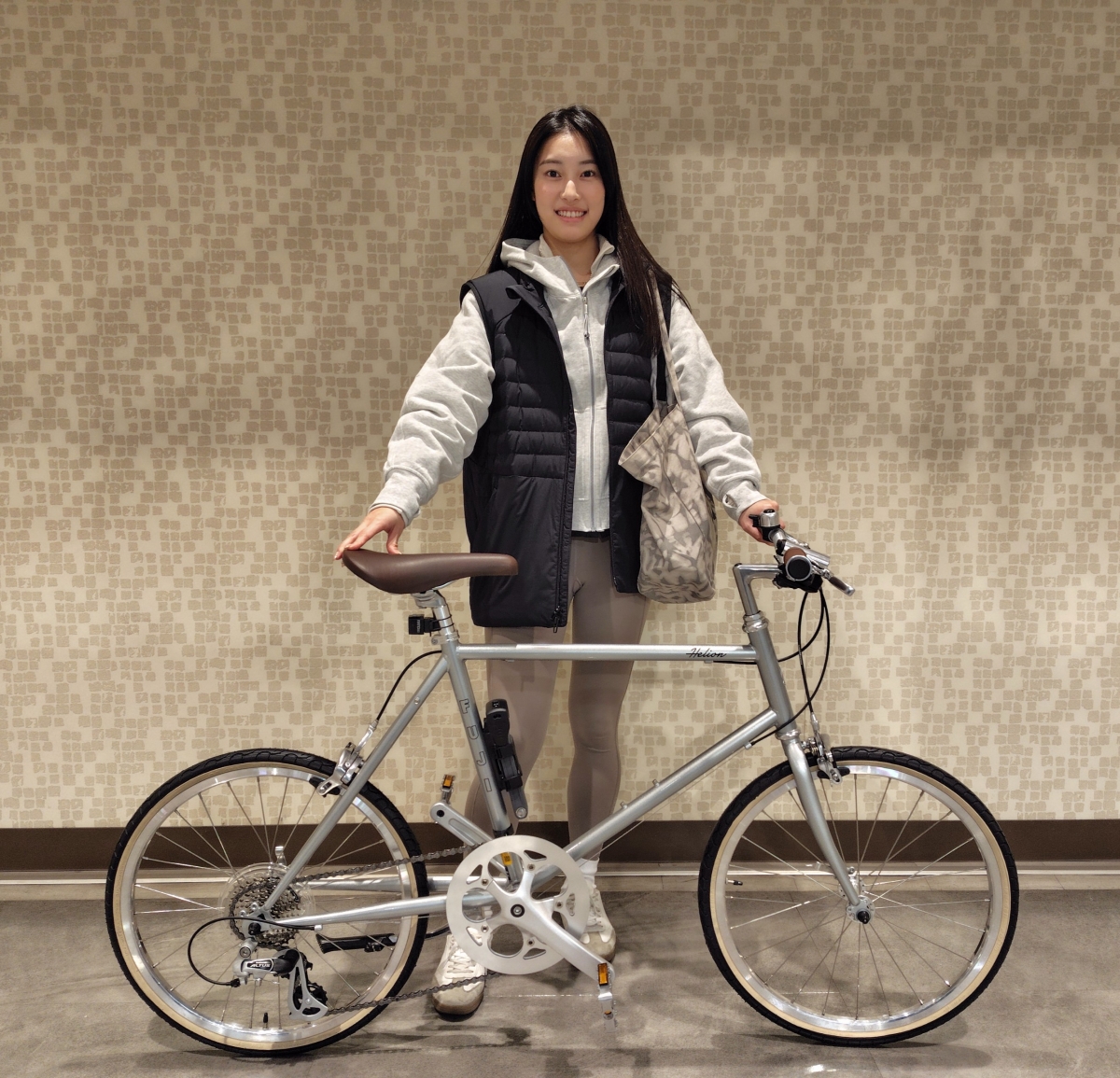 メーカーはFUJIで決め打ち!ミニベロのサイズ感やシルバー系で揃ったカラー、クロモリフレームの細身でカッコイイところ。同じFUJIのシングルスピード、STROLLを乗っている方の車体を気に入られたとの事で、こちらのHELIONにされました。