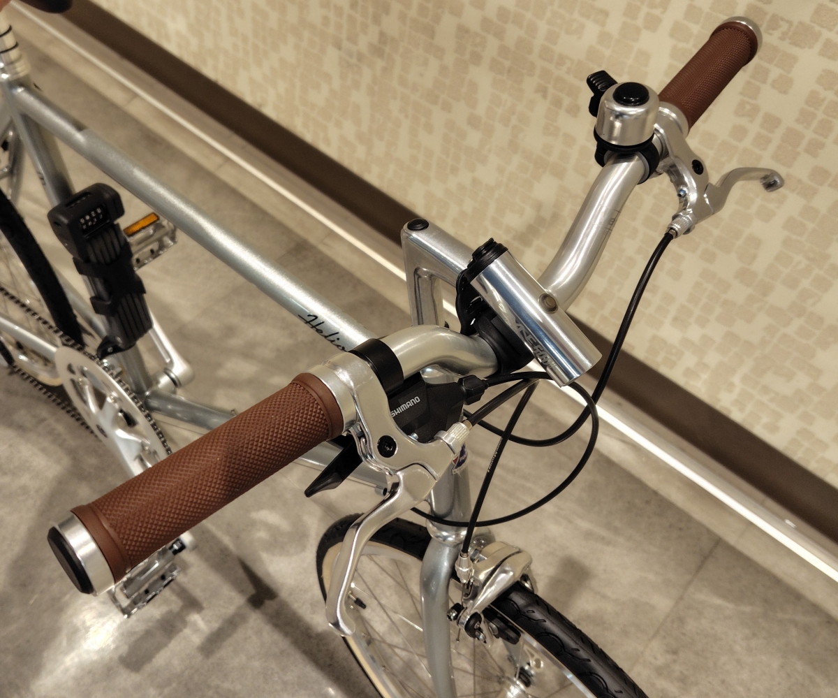 アップライズしたシルバーのハンドルバーと、同じくシルバーでクラシカルな雰囲気のレザインのフロントライト。フレームにはKEEPERのエコダイヤコースも施工してあります!
