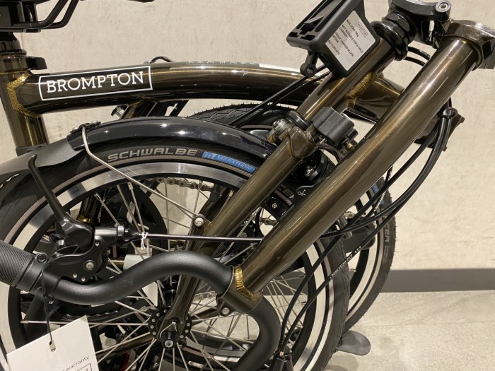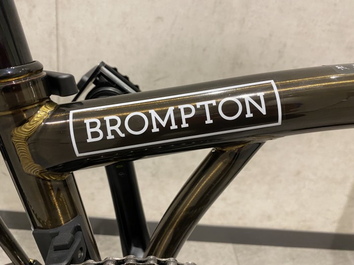 職人の技が表面に現れているのがラッカーカラー最大の見どころと言えます。※スタッフ田口の個人的な意見です。ご存じの方も多いかもしれませんがBROMPTONはMade in UK、職人たちが丹精を込めて一台一台作成しています。パイプをつなげる手法はロウ付けという方法が採用されています。真鍮(しんちゅう)を溶かして接着剤のように用いてパイプ同士をつなげます。溶かした真鍮は高温に熱された部分を流れていくため、パイプのつなぎ目をピンポイントかつ熱による歪みを最小限に抑えるため短時間で均一に予熱する必要があります。金色の真鍮が均等な幅で複雑なパイプの継ぎ目をぐるっと一周している、これこそが職人の高い技術の証明なのです。晩酌のお供にしたいですね。