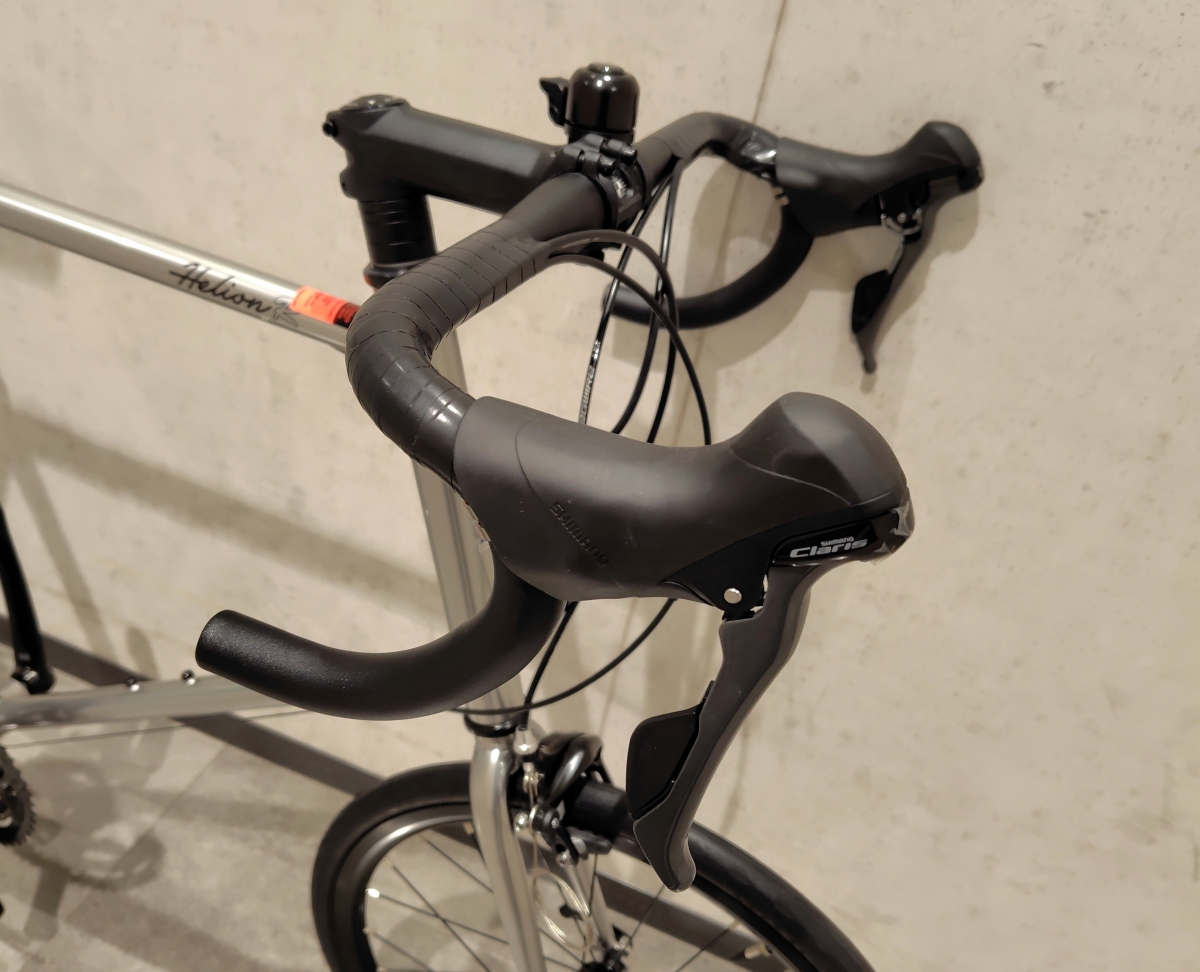 ハンドルはFUJIオリジナルのアルミ製です。アヘッドタイプのステムが採用されているのでハンドルポジションの調整がしやすくなっています。メインコンポはシマノのクラリスです。