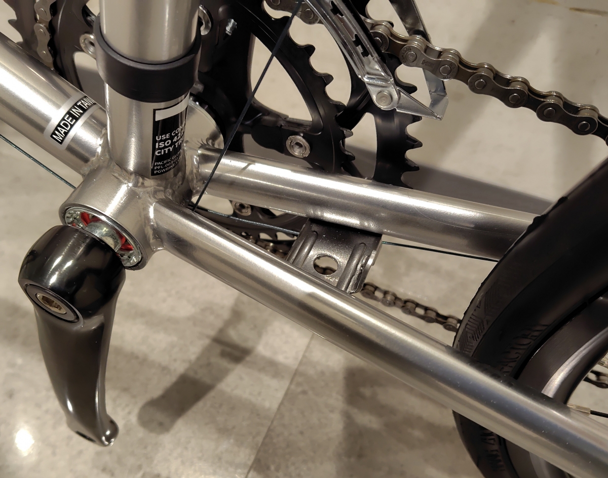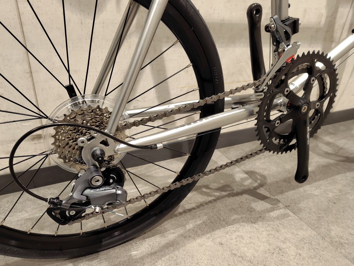 クランクがスギノである以外はシマノ製がさいようされています。フロントチェーンリングは52×39Tのダブル、リヤスプロケットは11-28Tで、2×8の全16段変速です。ロードバイクと比較するとクロス気味なギヤの組み合わせですが、20×1-1/8の細めの小径タイヤはトルクが掛かるので問題なく快適にご使用になれます!