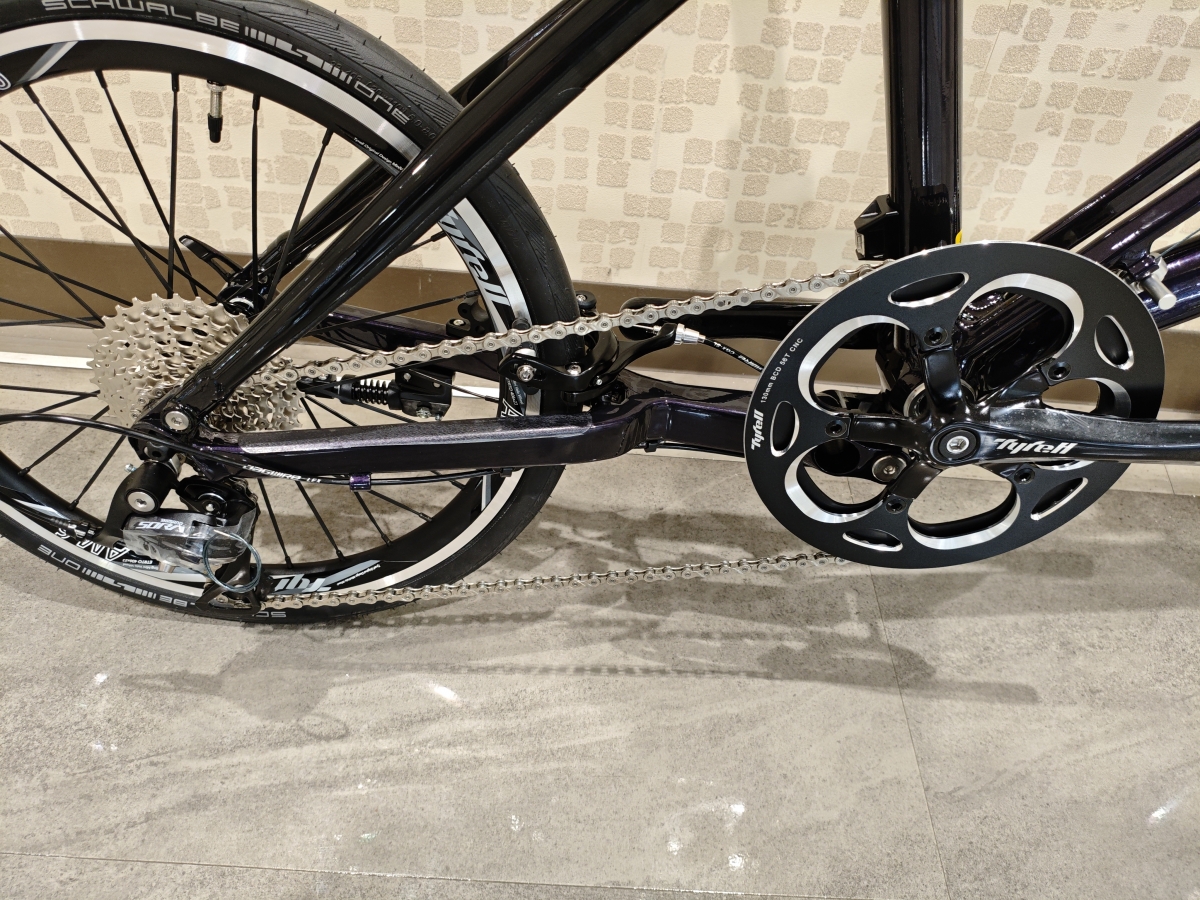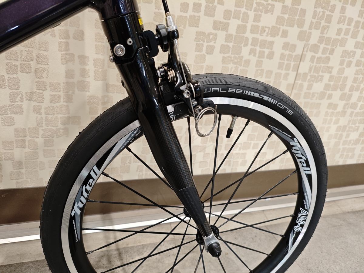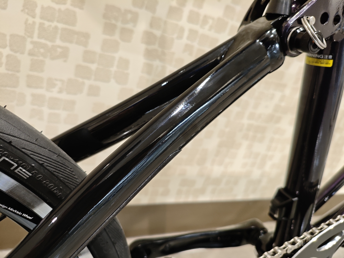 タイヤクリアランスは既にギリギリですね。デフォルトの20×1.1のままでの使用推奨ですね。