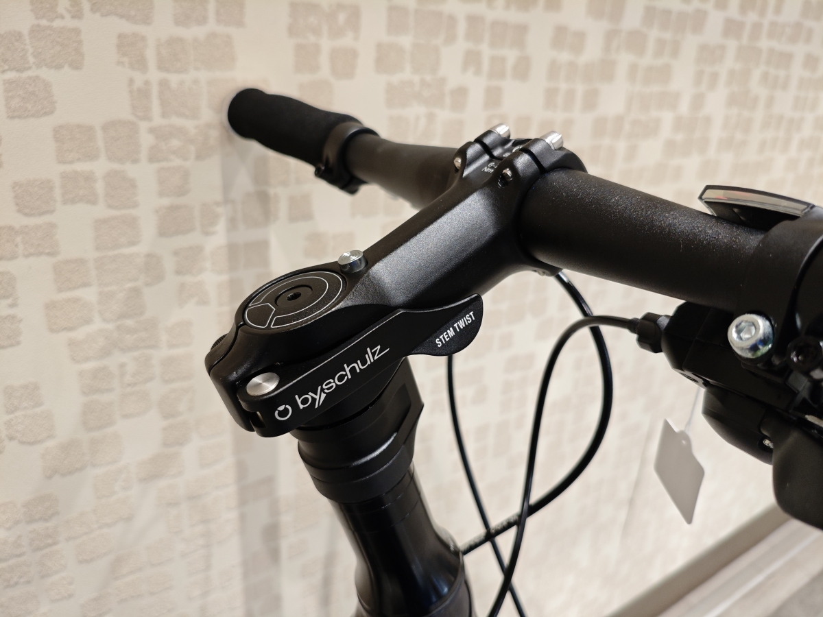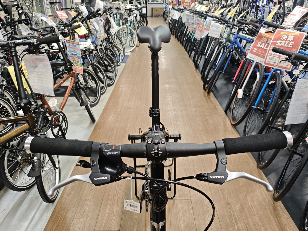 ハンドルは520mm幅のフラットバー。この車種はハンドル幅がそのまま折りたたみサイズに影響するので、操作性を悪くしない範囲でのコンパクトさというとこのくらいがベストなのかもしれません。
