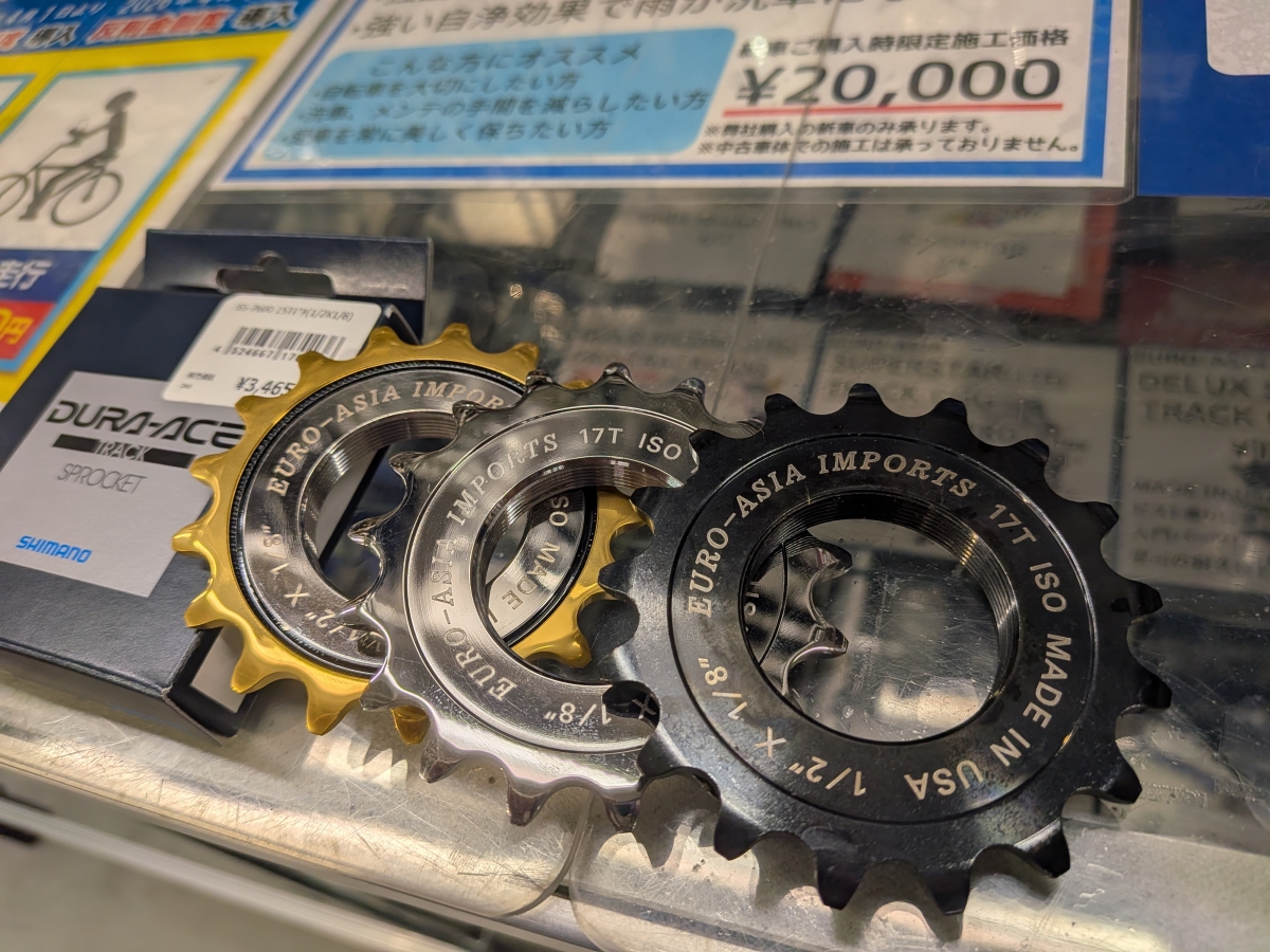 SHIMANOやユーロアジアと言った定番品や高性能コグも展示中です。ドレスアップにはもちろん、走行感もガラッと変わりますので、ぜひ固定コグも挑戦してみてください!!