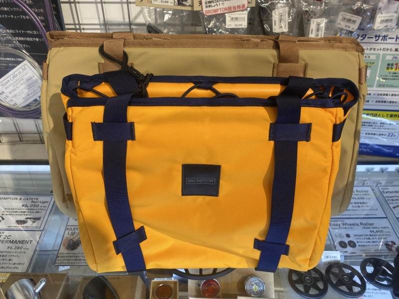 BROMPTONといえばフロントバッグ!!純正、サードパーティ製、かなり多くのラインナップを誇ります。当店で人気なのは純正のバスケットバッグ。