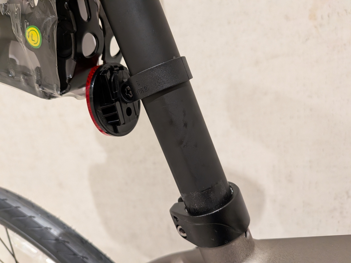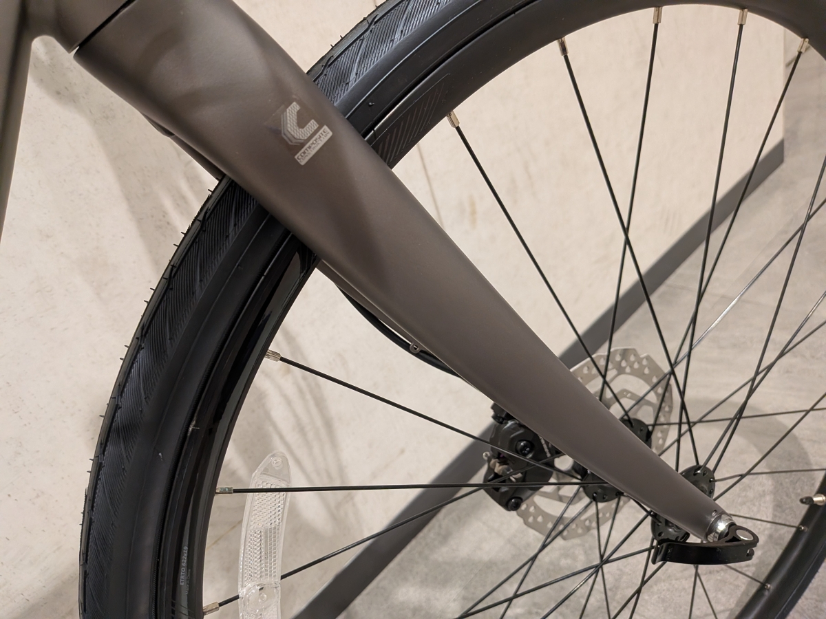 軽量さと振動吸収性に優れたカーボン素材をフロントフォークに採用。10万円台のクロスバイクだとかなりの確率でカーボンフォークですね。
