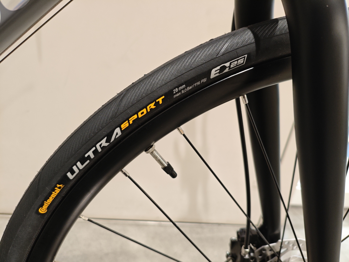 デフォルトのタイヤはちょっと重いのと、グリップ感が控えめなので700×28cにサイズダウンしてグリップ感の良いウルトラスポーツⅢに!