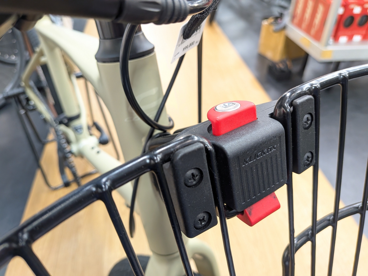 今回はTERN LUGGAGE TRUSS 2.0 という商品を取り付けてみました。耐荷重が7kgとなっており、RIXEN&KAULから出ているヘッドチューブアダプターよりも頑丈な造り。脱着のボタンをロックできる機構となっているので、バスケットの盗難も防止できます。