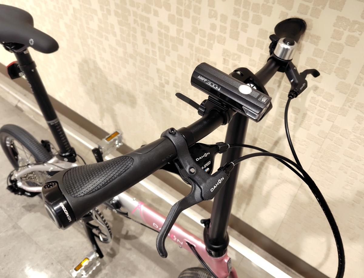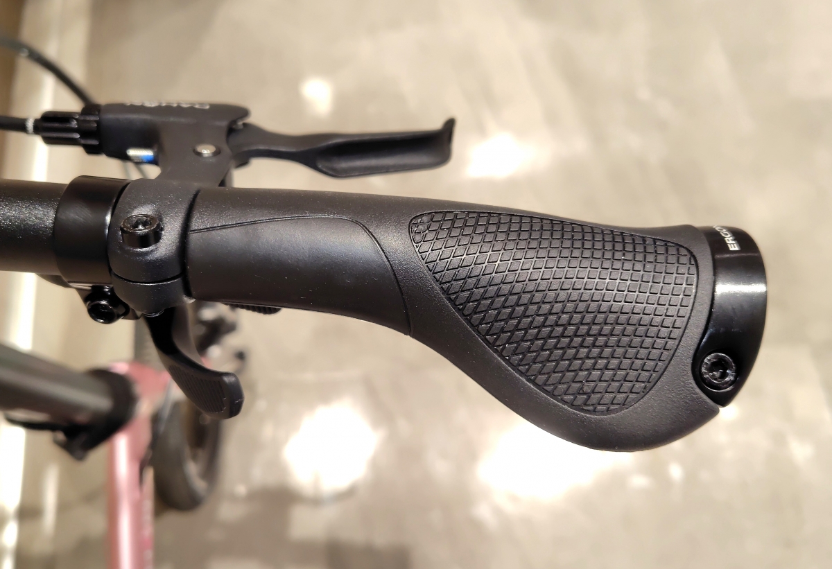 グリップをERGONのGP1に交換。「長い距離を乗りたい」と言う事で、最初から手の平への負担を減らすエルゴグリップにしております!もちろん折畳に支障はございません!