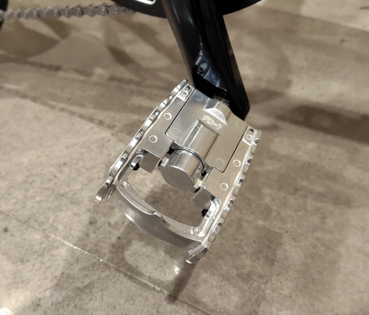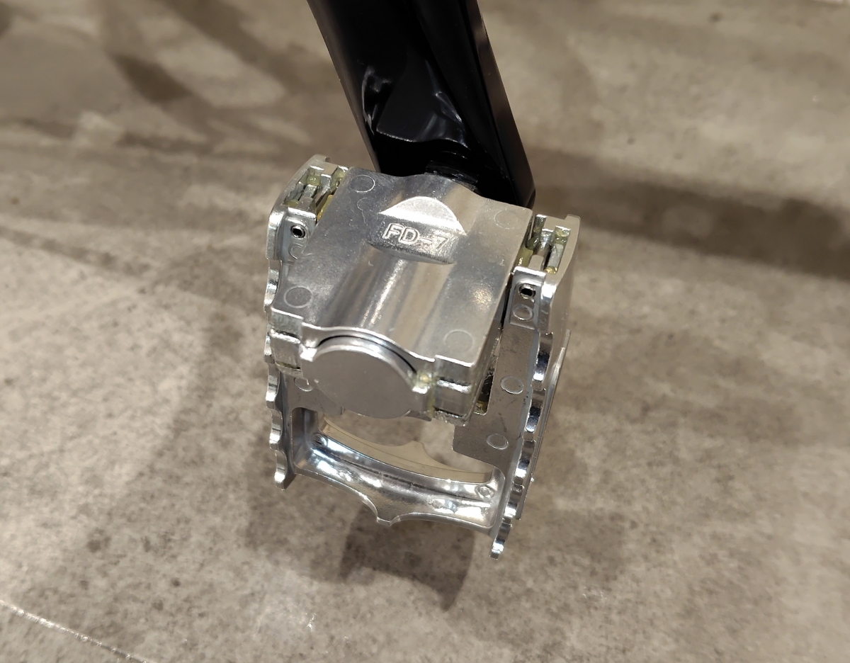 ペダルをMKS(三ヶ島)ペダルのFD-7に!通常付属しているペダルは右側のペダルがはずせるMKSのONE-SIDE EZYでしたが、輪行時にペダルをはずさない折畳タイプのFD-7に交換!折畳タイプは樹脂製だと外側を踏みすぎると傷みやすいところがありますが、金属ペダルなので使いやすさも強度も上がっています!