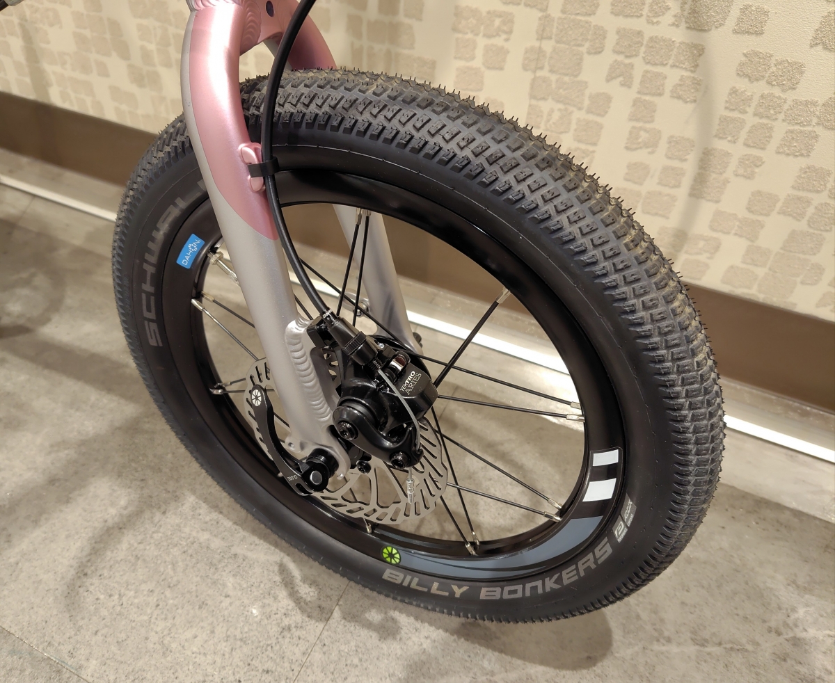 一枚目の画像から存在感が違うタイヤですね!SCHWALBE BILLY BONKERS、サイズは16×2.00!通常は16×1.5なので0.5インチ太くなっています!K9Xはこのタイヤサイズが付けられるので、乗り心地や安定性を求められるなら最初から交換するのもおススメです。タイヤが太くなる場合、チューブも交換になりますのでご承知おきを!