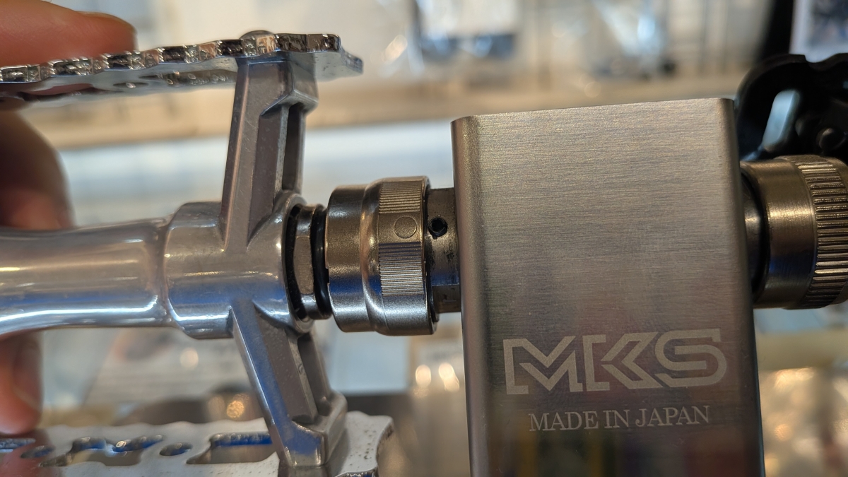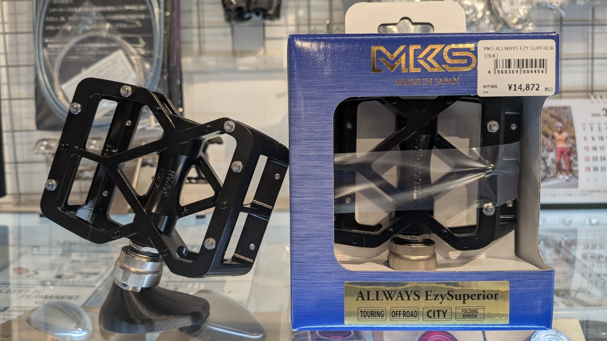 EzyシステムはMKS独自の脱着システム。工具いらずでペダルを脱着できるので、輪行の際にかなり便利になります。屋内保管をする方でペダルを外したいという声も有ったり…個人的にもちょっと欲しい。
