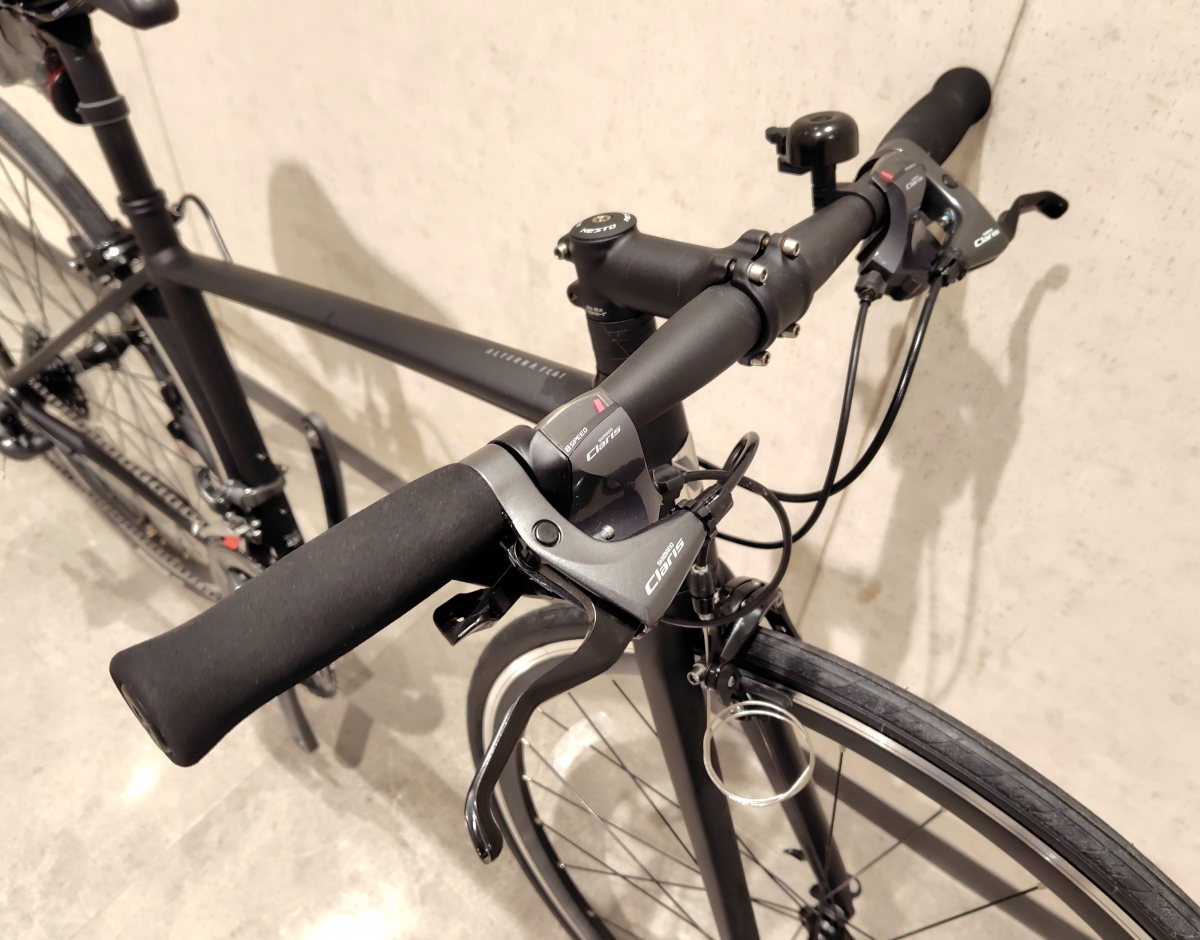 ハンドルは580mm幅のストレートタイプ、グリップはスポンジグリップが採用されています。ブレーキレバーと変速レバーはシマノのクラリスです。変速はラピッドファイヤ―プラスでリリースレバーが2WAY、つまりワイヤーを緩める方のレバーは人差し指と親指のどちらでも操作が可能です。また、ハンドルとレバーをロード用STIに交換する事も可能です!ヘッドチューブは上下異形のテーパータイプなのでハンドル周りの剛性は高くて安心感があります。ちなみにフロントフォークはアルミ製ですが、他メーカーのカーボンフォークに換装するなんて事も出来たりします。