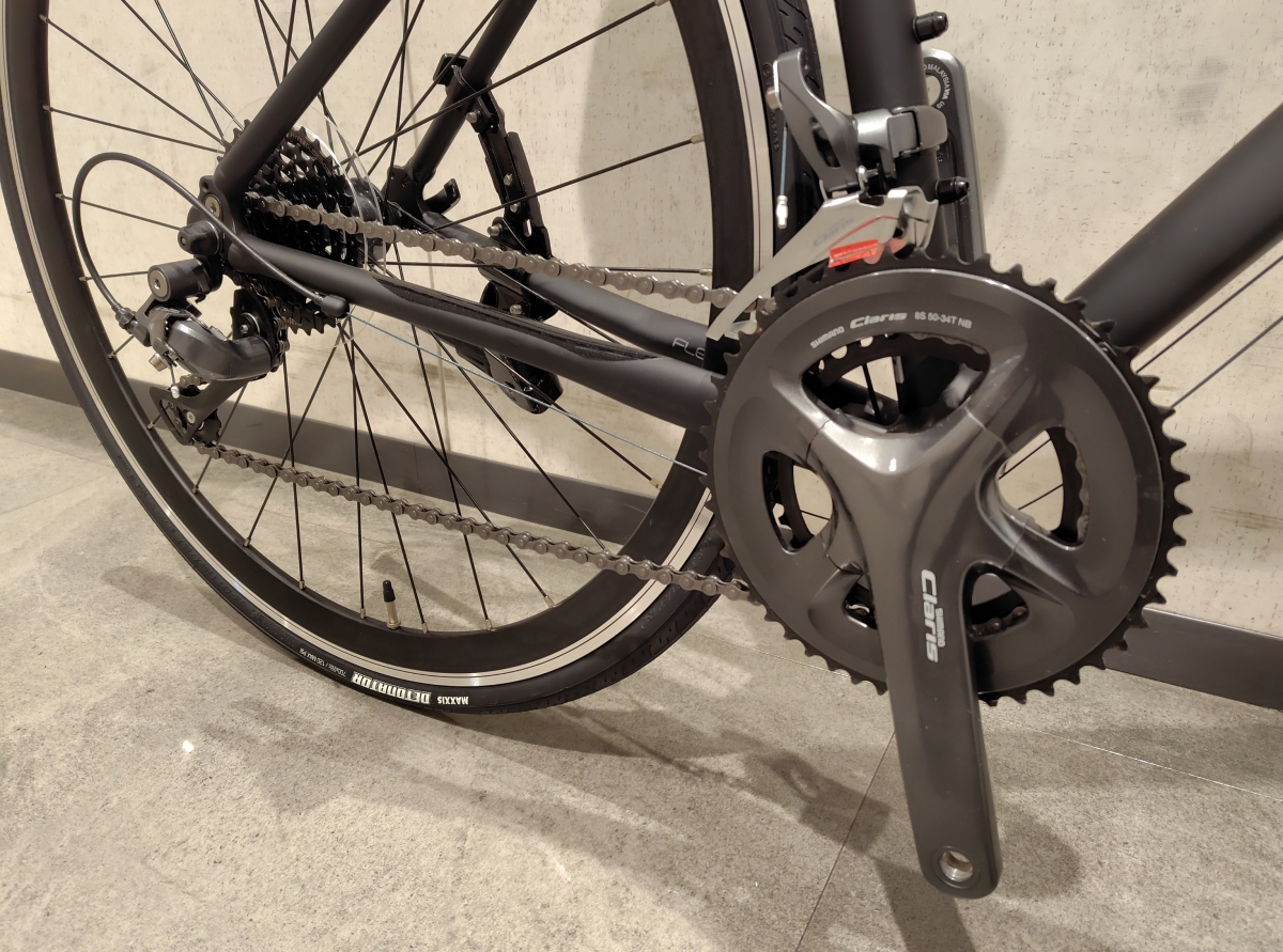 チェーンリングは50x34Tのダブル、スプロケットは11-32Tの8速、全16段変速です。ワイドなギヤ構成なのでオールラウンドに使いやすいと思います。2ピース構造のクランクは剛性があり、ペダルを踏んだ力がしっかり推進力に変換されていくのがわかるかと思います。タイヤサイズは700x28cと細めです。