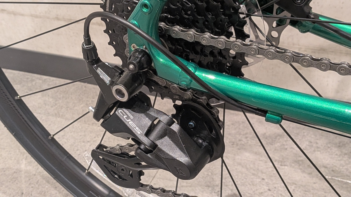 変速機にはSHIMANOのCUESを採用。耐久性の高さはもちろん、確実なシフトチェンジのおかげでチェーン落ちなどのトラブルが少ないのも魅力ですね。