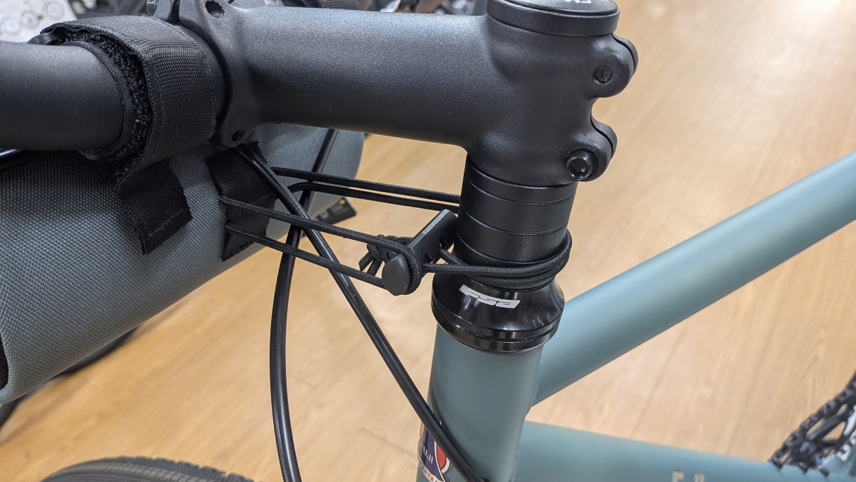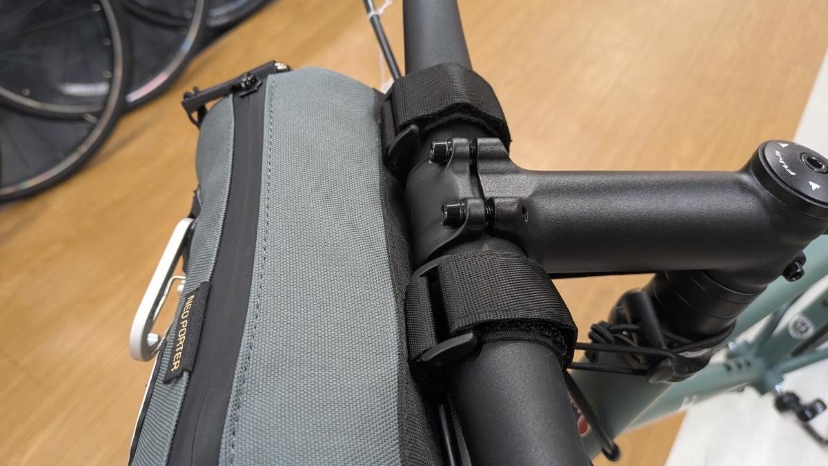 取付けにはハンドルバーへ2カ所のベルクロでの固定と、コラム部分をフックで固定する3点止めとなっています。