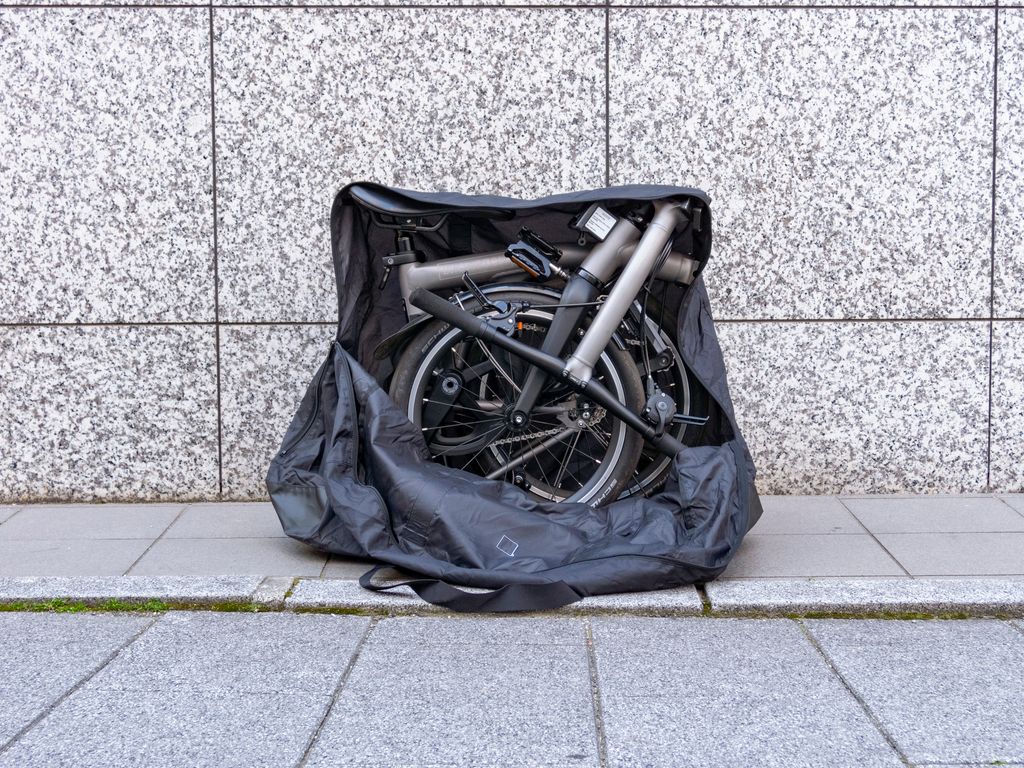 この通りBROMPTONを入れてみると奇跡的なフィット感!もうBROMPTON用と言っても怒られないくらいの収まりの良さです!袋の中で車体が暴れない程度に寸法に余裕があるので、ハンドルやペダルなどの張り出している部分のひっかりを気にせず車体を収納できます!私のような不器用人間には雑に入れられるというだけで値千金です!