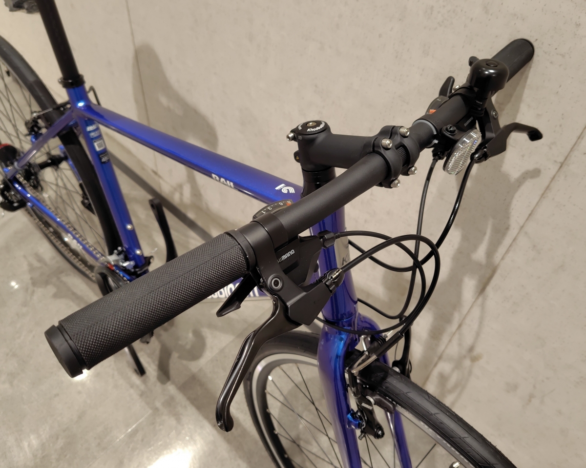 ハンドルは幅560mmのアルミ製ストレートタイプ、ステムは角度7度の90mm長でハンドルと同様のアルミ製です。グリップはラバーの丸型です。長い距離、時間を走るならグリップは握り面の広いエルゴグリップに交換しても良いですね。レバー部分はブレーキレバーがTEKTROの2フィンガー、シフトレバーはSHIMANOのラピッドファイヤ―プラスが採用されています。ブレーキはSHIMANOのBR-T4000、Vブレーキとなります。