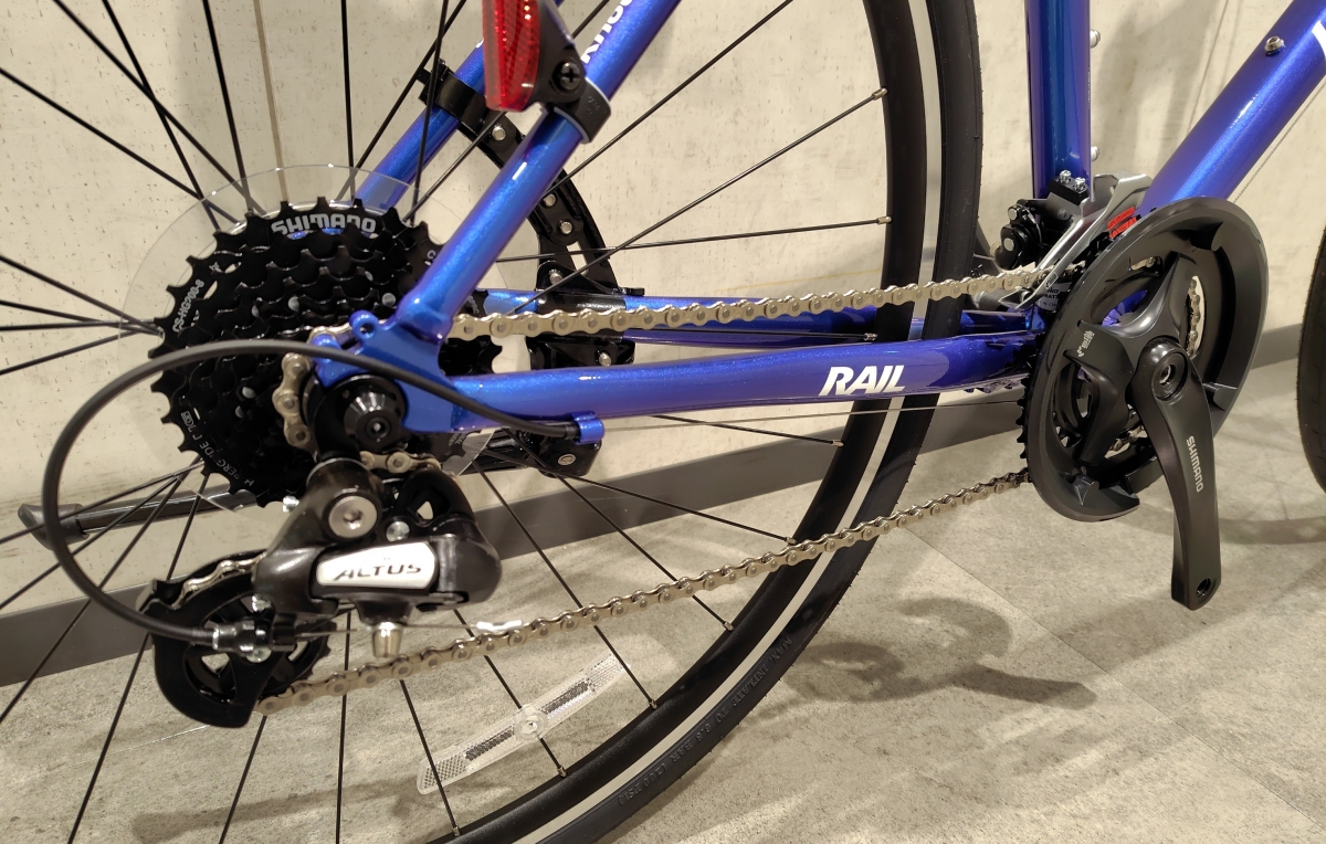 クランクはSHIMANOのチェーンガード付き46x30Tのダブル、リヤスプロケットは12-32Tの8速、全部で16段変速になります。ハンドル周りのレバー類、変速パーツ等のほとんどにSHIMANOパーツが採用されていて車体のクオリティーが高いです!タイヤはMAXXIS DETONATOR、サイズは700x32Cとスポーティな細さです。軽量で走行感も軽くて良いタイヤです。