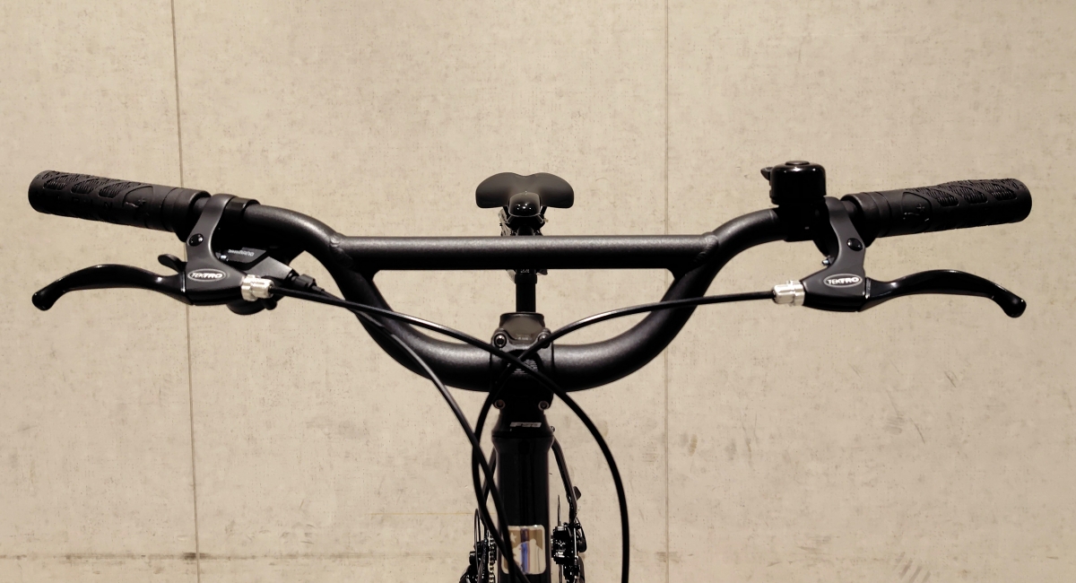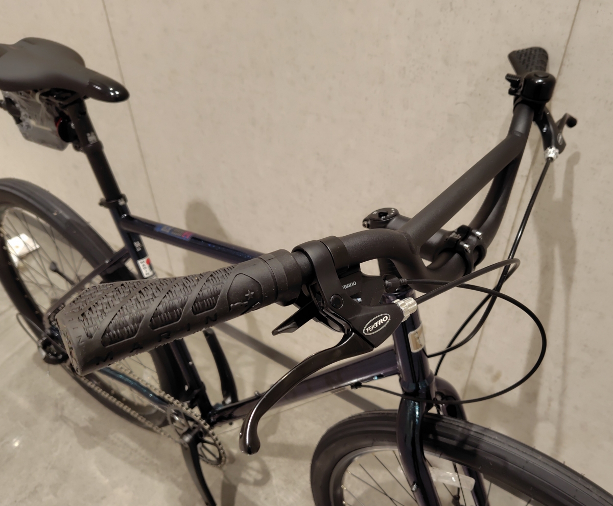 ハンドルは実寸700mm幅のBMXスタイル、ハンドルのクランプ部分からアップライズなグリップ位置になるので上半身が楽な姿勢がとれます。また一般的なクロスバイクのハンドル幅が560~580mmと比べると、700mmのハンドル幅はゆったりとしたハンドリングが楽しめます。グリップはマリンオリジナルのエルゴグリップ、レバー部分はブレーキがテクトロの3フィンガータイプ、変速レバーはシマノになります。