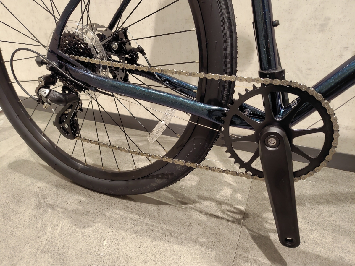 フロントチェーンリングは42Tのシングルギヤ、リヤは11-32Tの8速仕様です。キツい坂を走るようなシチュエーションだとあと少し軽いギヤが欲しいかもしれませんが、街中や軽いサイクリングで走るなら特に問題はないでしょう。リヤ変速のみなので前後のギヤ組み合わせを考えなくて済むのもメリットですね。