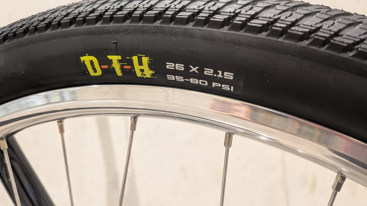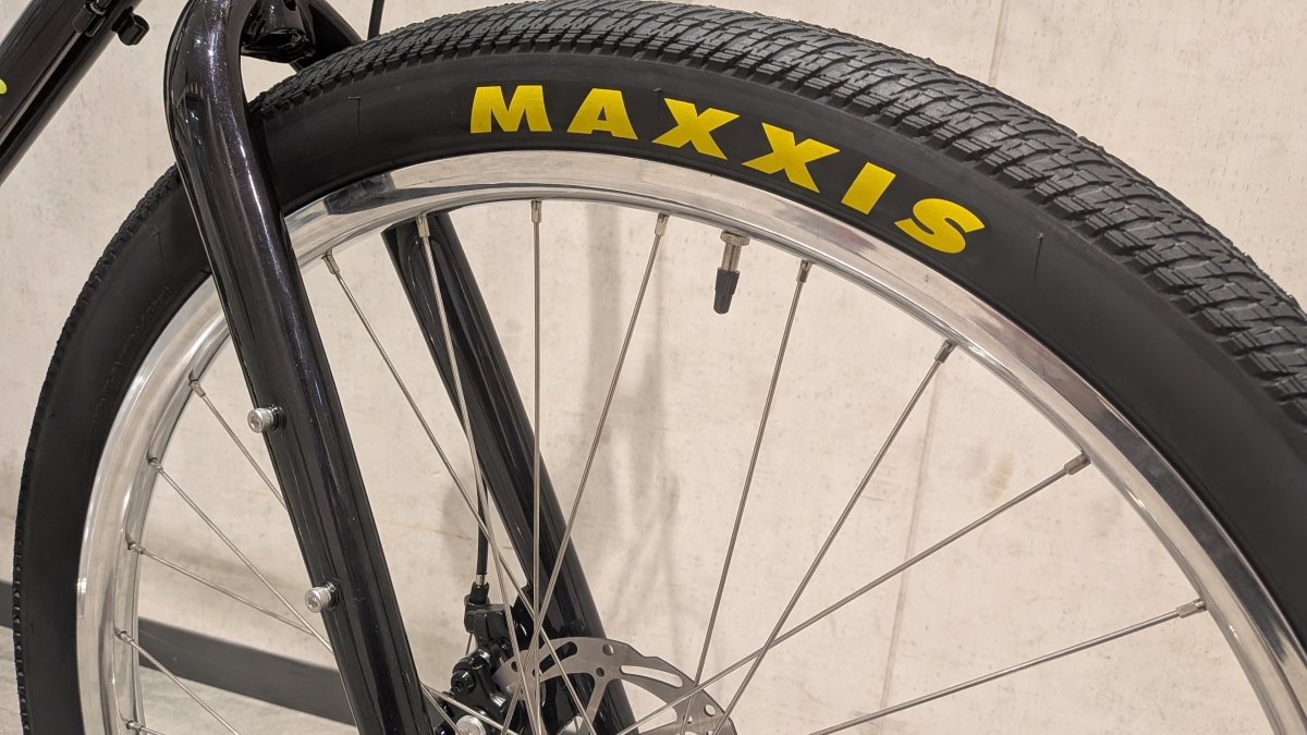 タイヤにはBMX用にデザインされたアーバン・ストリートタイヤのMAXXIS DTHにしてみました。MAXXISロゴのイエローがイイ感じ。標準のタンサイドタイヤからオールブラックのタイヤにするだけでもけっこう雰囲気変わりますね。幅も1.95インチから2.15インチへ太くすることで安定感もアップ。より街乗り仕様になりました。