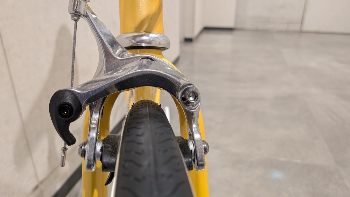 現在のブレーキの主流はディスクブレーキですが、STROLLは昔ながら(?)のリムブレーキとなっています。通称キャリパーブレーキと呼ばれるこのつくりはロードバイクに良く見られるもので、あまりタイヤを太くすることができないというイメージが有ります。