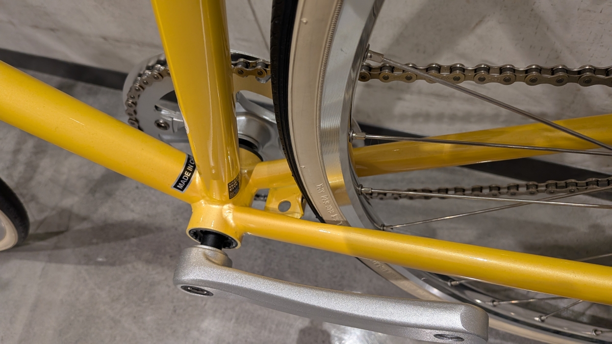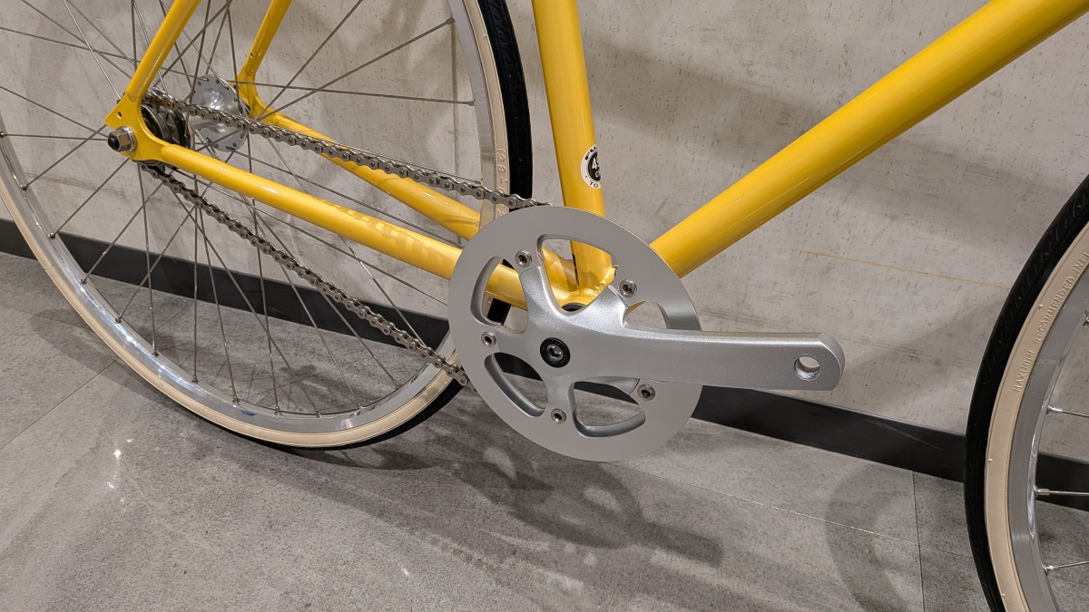 STROLLは同じFUJIのピストバイクよりもギア比が軽く設定されています。具体的に言うとSTROLLが2.75、FEATHERが2.875、TRACK ARCVが3.0といった感じです。漕ぎだしは少し力がいりますが、スピードに乗れば楽に漕ぎ続けられるくらいかと思います。もちろん、コグと呼ばれる歯車を交換すればもう少し軽いギア比にすることも可能です。