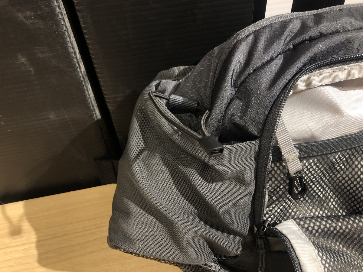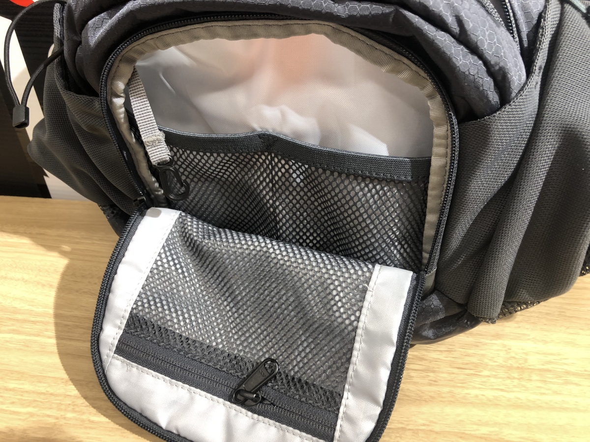 メインポケットの他、ツール等を整頓して収納しやすい前面のツールポケット、中型のスマートフォンなどをしまいやすいサイドポケット、ボトルホルダーを備え、しっかりとグッズを収納できます。ハイドロホース用のホースキャッチも設けられていて、ハイドレーションパックも1.5リットルまで使えます。