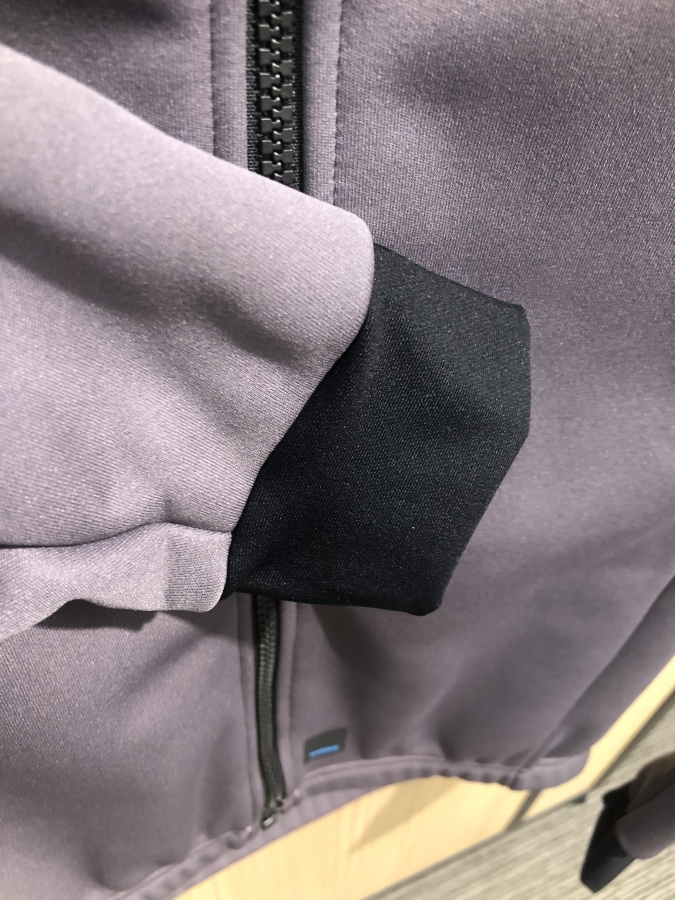 襟は高めで首筋をしっかり守ります。袖口も太めのエラスティックカフがしっかりとやさしく手首を包みウェア内に冷気が入るのを防いでくれます。
