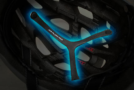 カーボンの弾性を最大限利用することでヘルメットの強度に影響を与えることなく、EPSフォームの密度を20%削減。安全性はそのままに大きなインテークを備え、クーリング性能も抜群です。