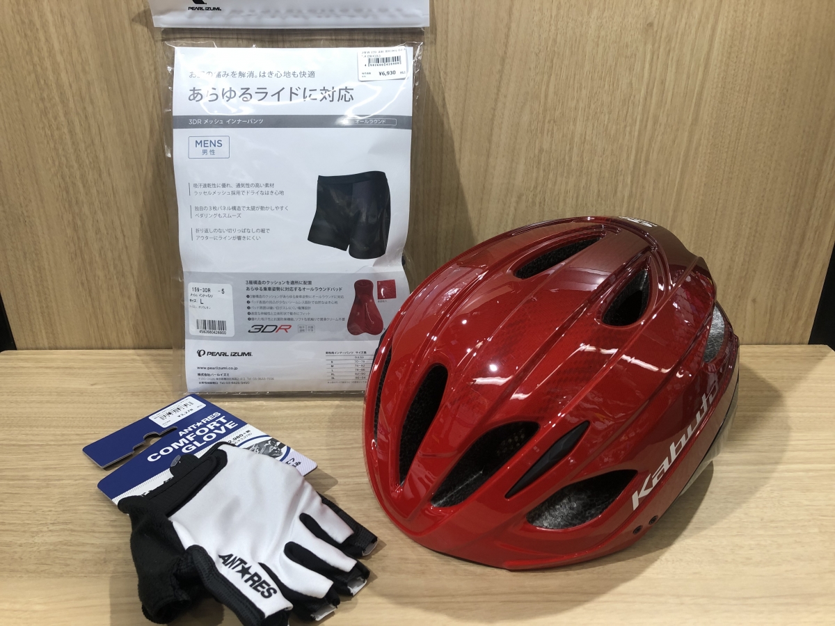 安全のためにヘルメットは必須‼REZZA-3があればそれはクリアできます。さらにサイクリングを快適に楽しむ為にオススメアイテムが2点。それはパッド付きパンツとグローブ‼身体を支える手とお尻を守ってくれるので、長時間のライドも快適に楽しめます‼