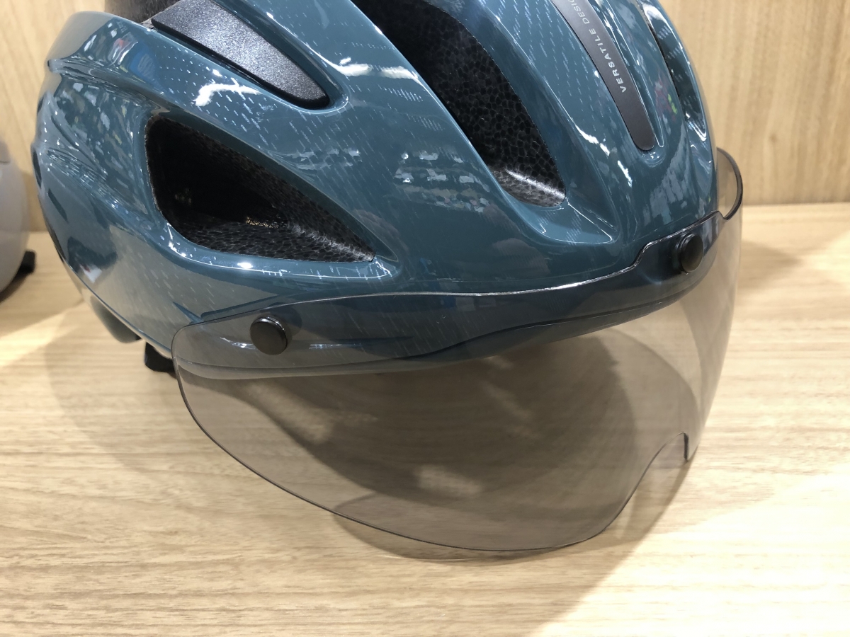 スポーティすぎない丸みを帯びたデザイン。コンパクトフォルムで初めてのヘルメットでも違和感が少ない。眼鏡との干渉を考慮したシールド装備。