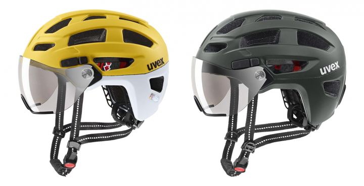 上のモデル同様に眼鏡対応のバイザーが付いたヘルメット。後部の衝撃保護を強化するため深めの構造となっています。こちらも道路での視認性を高めるLEDライトが付属します。19個のベンチレーションもあり気性に優れています。