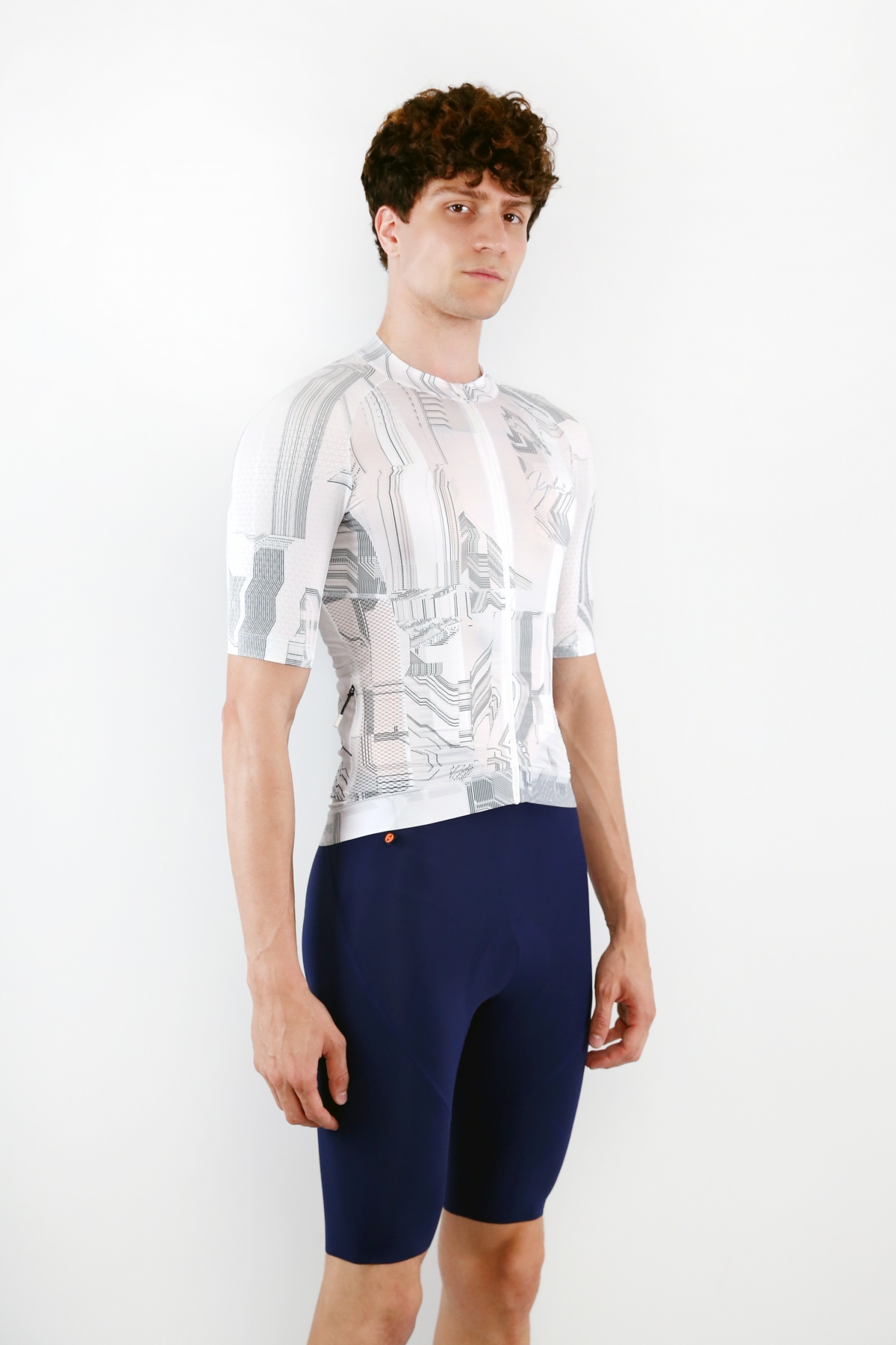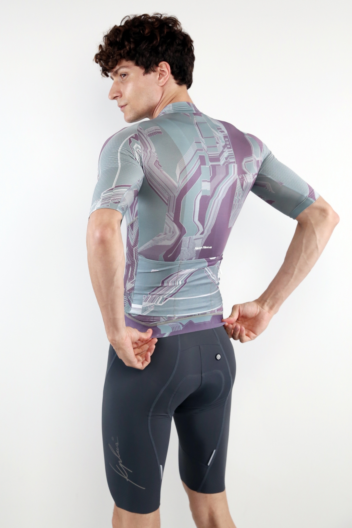 サイクリストが走り出す頃に差し込む朝日の光、街に煌めくネオンの輝き、都市を巡る幾何学的な道路網やビル群をモチーフにしたパターンを未来的に再現しました