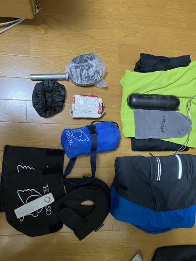 ツーリングだと、輪行セット(輪行袋、スプロケカバー、ディスクローターカバー、チェーンカバー×2)、パンク修理キット(電動ポンプ、付属品、700×28CCチューブ×2)、着替え(上下、下着)、防寒着(冬も使うことを想定して)
