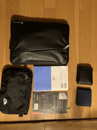 パソコンケース(タブレット、ノートパソコン)、充電ケーブル等を入れた袋、本×2、財布×2(クレジットカードと現金はいつも別々です)