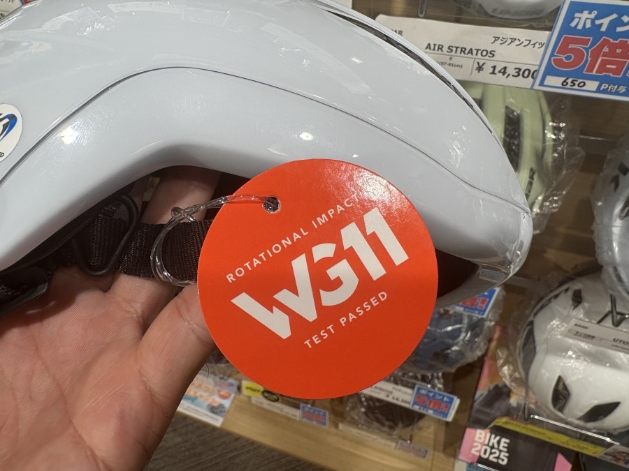 KASKのヘルメットは直接的な方向の衝撃だけでなく、前のめりや転がってしまった際に発生する回転衝撃にもしっかり対応しています。それを証明するのが、KASK独自の衝撃テストWG11。このマークが付いているヘルメットはKASKが保証する耐回転衝撃に優れるヘルメットなんです。