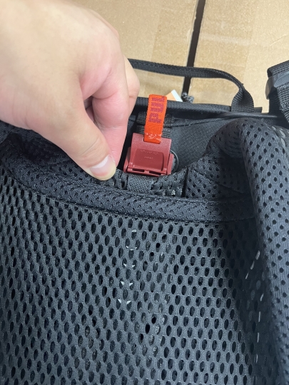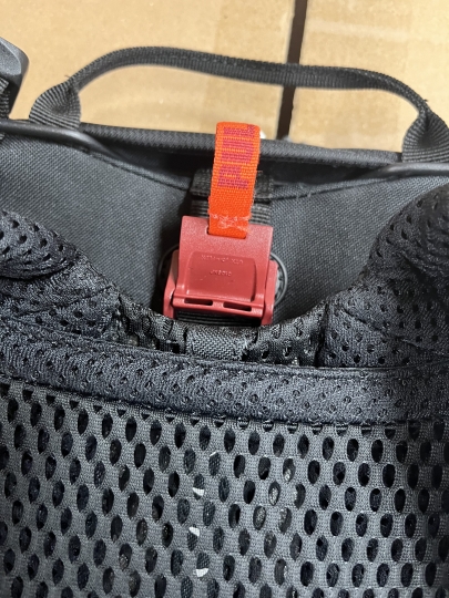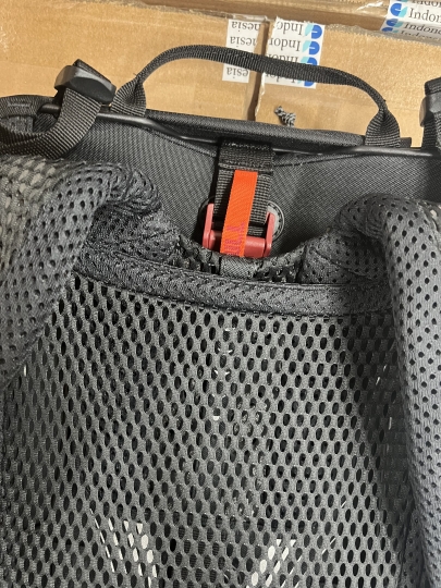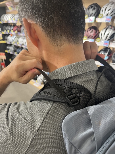 肩の後ろにあるトップスタビライザーをひっぱりバックパックと背中を埋めます。