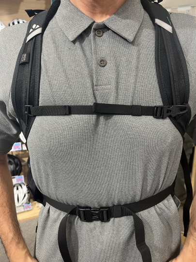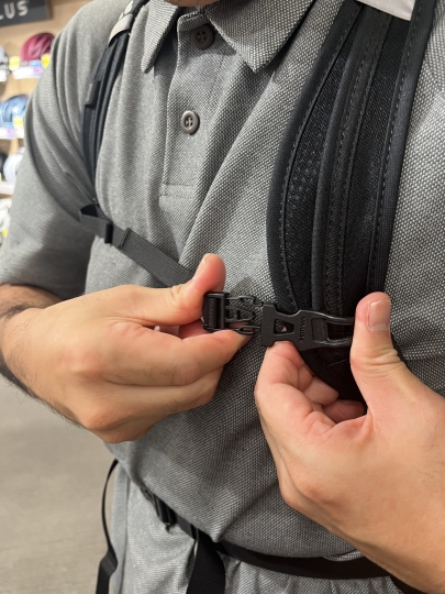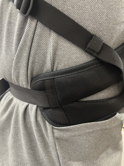 チェストベルトは鎖骨の少し下、肩関節の延長線上に高さを調整します。
