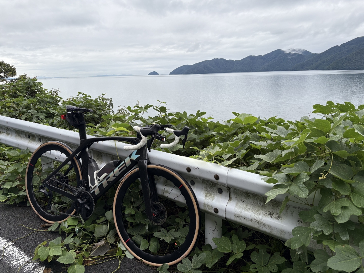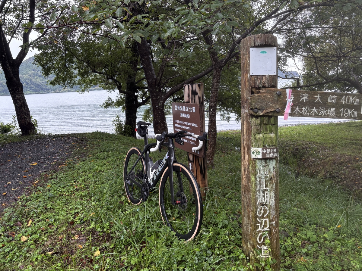 琵琶湖湖畔にて。ここがどこかは定かではありませんが、海みたいですよね。この直前は高速の下りが続いていたのですが、30Cのタイヤ幅だと安心感があっていいですね。滑るような事も無く、雨でも気持ちよく降れました。